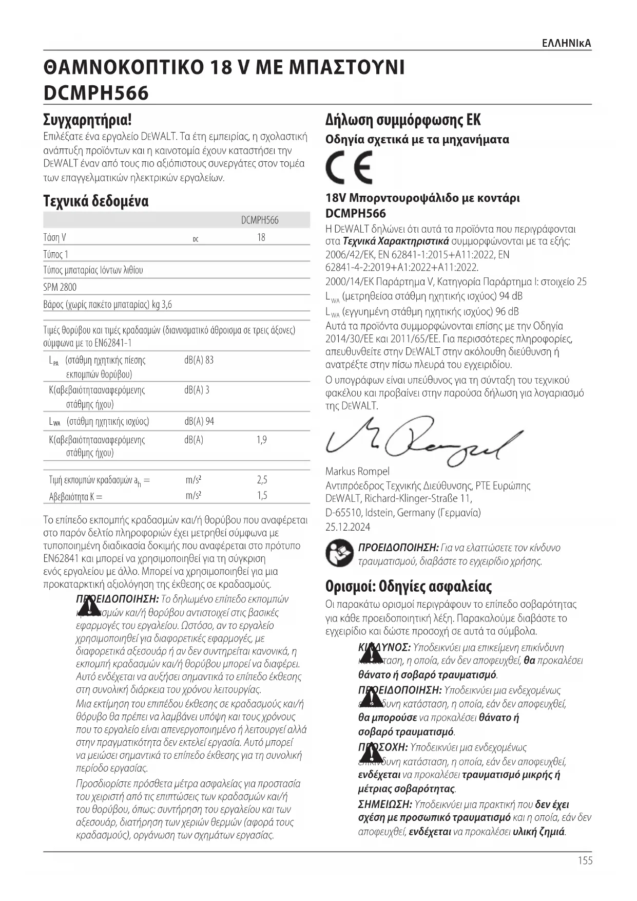 (εγγυημένη στάθμη ηχητικής ισχύος) 96 dB Αυτά τα προϊόντα συμμορφώνονται επίσης με την Οδηγία 2014/30/ΕΕ και 2011/65/ΕΕ. Για περισσότερες πληροφορίες, απευθυνθείτε στην DeWALT στην ακόλουθη διεύθυνση ή ανατρέξτε στην πίσω πλευρά του εγχειριδίου. Ο υπογράφων είναι υπεύθυνος για τη σύνταξη του τεχνικού φακέλου και προβαίνει στην παρούσα δήλωση για λογαριασμό τηςDeWALT. Markus Rompel Αντιπρόεδρος Τεχνικής Διεύθυνσης, PTE Ευρώπης DeWALT, Richard-Klinger-Straße 11, D-65510, Idstein, Germany (Γερμανία)
