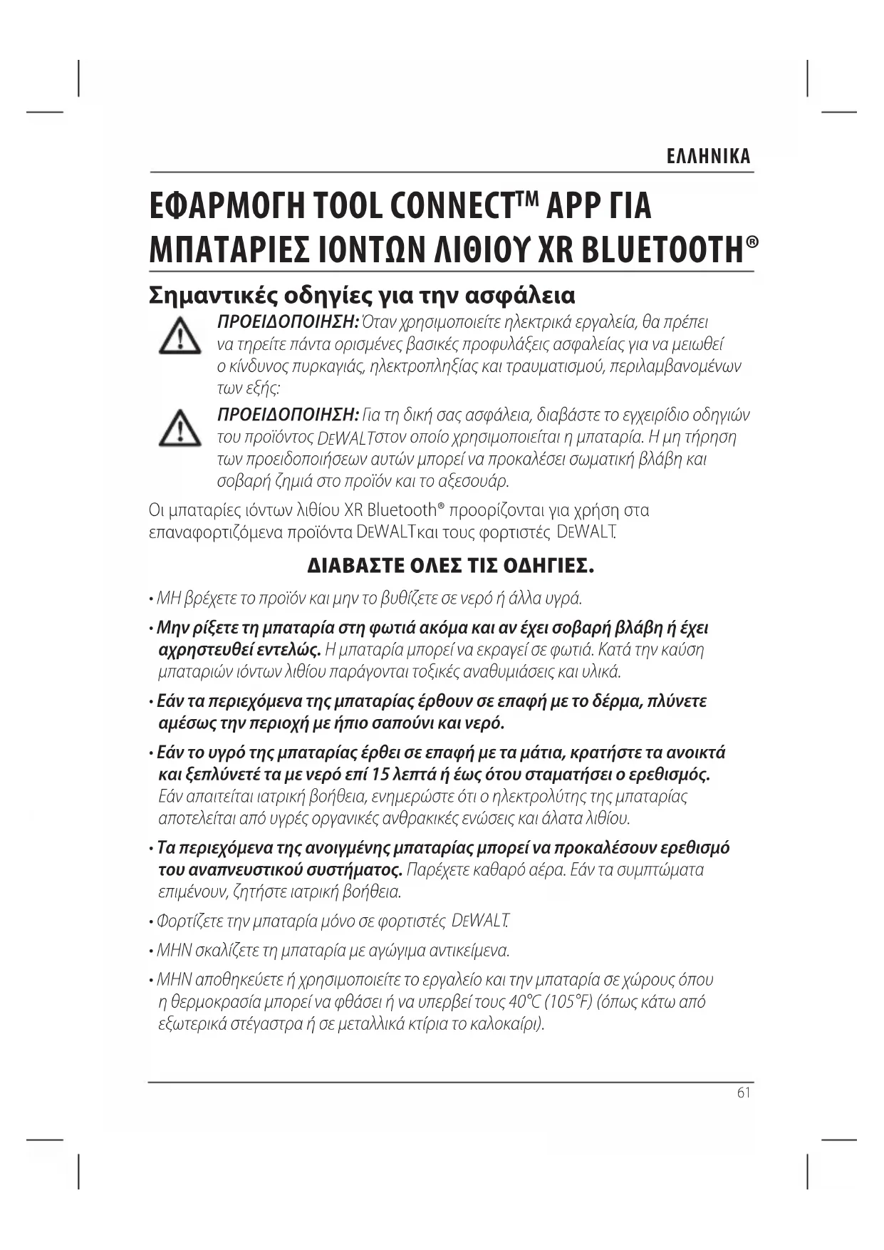 ΠΡΟΕΙΔΟΠΟΙΗΣΗ: Για τη δική σας ασφάλεια, διαβάστε το εγχειρίδιο οδηγιών του προϊόντος DEWALT στον οποίο χρησιμοποιείται η μπαταρία. Η μη τήρηση των προειδοποιήσεων αυτών μπορεί να προκαλέσει σωματική βλάβη και σοβαρή ζημιά στο προϊόν και το αξεσουάρ. Οι μπαταρίες ιόντων λιθίου XR Bluetooth® προορίζονται για χρήση στα επαναφορτιζόμενα προϊόντα DeWALT και τους φορτιστές DeWALT