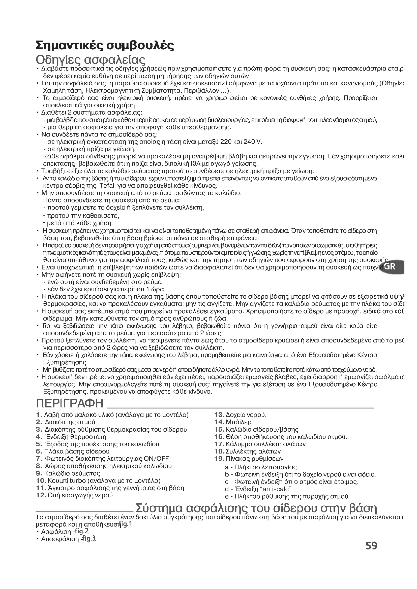 ΣΣηηµµααννττιικκFFAA σσυυµµββοουυλλFFAA ΟΟδδηηγγεε αασσφφααλλεεαα ∆ιαβστε προσεκτικ τι οδηγε χρσεω πριν χρησιµοποισετε για πρτη φορ τη συσκευ σα: η κατασκευστρια εταιρεαδεν φρει καµα ευθνη σε περπτωση µη τρηση των οδηγιν αυτν. Για την ασφλει σα, η παροσα συσκευ χει κατασκευαστε σµφωνα µε τα ισχοντα πρτυπα και κανονισµο (Οδηγε γιαΧαµηλ τση, Ηλεκτροµαγνητικ Συµβαττητα, Περιβλλον ...). To ατµοσδερ σα εναι ηλεκτρικ συσκευ: πρπει να χρησιµοποιεται σε κανονικ συνθκε χρση. Προορζεται αποκλειστικ για οικιακ χρση. ∆ιαθτει 2 συστµατα ασφλεια: µια βαλβδα που αποτρπει κθε υπερπεση, και σε περπτωση δυσλειτουργα, επιτρπει τη διαφυγ του πλεονσµατο ατµο, µια θερµικ ασφλεια για την αποφυγ κθε υπερθρµανση. Να συνδετε πντα το ατµοσδερ σα: σε ηλεκτρικ εγκατσταση τη οποα η τση εναι µεταξ 220 και 240 V. σε ηλεκτρικ πρζα µε γεωση.Κθε σφλµα σνδεση µπορε να προκαλσει µη ανατρψιµη βλβη και ακυρνει την εγγηση. Εν χρησιµοποισετε καλδιοεπκταση, βεβαιωθετε τι η πρζα εναι διπολικ I0A µε αγωγ γεωση. Tραβξτε ξω λο το καλδιο ρεµατο προτο το συνδσετε σε ηλεκτρικ πρζα µε γεωση. Αν το καλδιο τη βση του σδερου χουν υποστε ζηµι πρπει επειγντω να αντικατασταθον απ να εξουσιοδοτηµνο κντρο σρβι τη Tefal για να αποφευχθε κθε κνδυνο. Μην αποσυνδετε τη συσκευ απ το ρεµα τραβντα το καλδιο.Πντα αποσυνδετε τη συσκευ απ το ρεµα: προτο γεµσετε το δοχεο ξεπλνετε τον συλλκτη,- ÚÔÙÔ‡ ÙËÓ Î·ı·Ú›ÛÂÙÂ,- ÌÂÙ¿ ·fi οı ¯Ú‹ÛË. Η συσκευ πρπει να χρησιµοποιεται και να εναι τοποθετηµνη πνω σε σταθερ επιφνεια. ταν τοποθετετε το σδερο στη βση του, βεβαιωθετε τι η βση βρσκεται πνω σε σταθερ επιφνεια. Η παροσα συσκευ δεν προορζεται για χρση απ τοµα (συµπεριλαµβανοµνων των παιδιν) των οποων οι σωµατικ, αισθητριε πνευµατικ ικαντητ του εναι µειωµνε, τοµα που στερονται εµπειρα γνση, χωρ την επβλεψη εν ατµου, το οποο θα εναι υπεθυνο για την ασφλει του, καθ και την τρηση των οδηγιν που αφορον στη χρση τη συσκευ. Εναι υποχρεωτικ η επβλεψη των παιδιν στε να διασφαλιστε τι δεν θα χρησιµοποισουν τη συσκευ ω παιχνδι. Μην αφνετε ποτ τη συσκευ χωρ επβλεψη: εν αυτ εναι συνδεδεµνη στο ρεµα, εν δεν χει κρυσει για περπου 1 ρα. Η πλκα του σδερο σα και η πλκα τη βση που τοποθετετε το σδερο βση µπορε να φτσουν σε εξαιρετικ υψηλθερµοκρασε, και να προκαλσουν εγκαµατα: µην τι αγγζετε. Μην αγγζετε τα καλδια ρεµατο µε την πλκα του σδερου. Η συσκευ σα εκπµπει ατµ που µπορε να προκαλσει εγκαµατα. Χρησιµοποιστε το σδερο µε προσοχ, ειδικ στο κθετοσιδρωµα. Μην κατευθνετε τον ατµ προ ανθρπου ζα. Για να ξεβιδσετε την τπα εκκνωση του λβητα, βεβαιωθετε πντα τι η γενντρια ατµο εναι ετε κρα ετε αποσυνδεδεµνη απ το ρεµα για περισστερο απ 2 ρε. Προτο ξεπλνετε τον συλλκτη, να περιµνετε πντα ω του το ατµοσδερο κρυσει εναι αποσυνδεδεµνο απ το ρεµαγια περισστερο απ 2 ρε για να ξεβιδσετε τον συλλκτη. Εν χσετε χαλσετε την τπα εκκνωση του λβητα, προµηθευτετε µια καινοργια απ να Εξουσιοδοτηµνο Κντρο Εξυπηρτηση. Μη βυθζετε ποτ το ατµοσδερ σα µσα σε νερ οποιοδποτε λλο υγρ. Μην το τοποθετετε ποτ κτω απ τρεχοµενο νερ. Η συσκευ δεν πρπει να χρησιµοποιηθε εν χει πσει, παρουσιζει εµφανε βλβε, χει διαρρο εµφανζει σφλµατα λειτουργα. Μην αποσυναρµολογετε ποτ τη συσκευ σα: πηγανετ την για εξταση σε να Εξουσιοδοτηµνο Κντρο Εξυπηρτηση, προκειµνου να αποφγετε κθε κνδυνο.1. Λαβ απ µαλακ υλικ (ανλογα µε το µοντλο)2. ∆ιακπτη ατµο3. ∆ιακπτη ρθµιση θερµοκρασα του σδερου4. νδειξη θερµοσττη5. ξοδο 