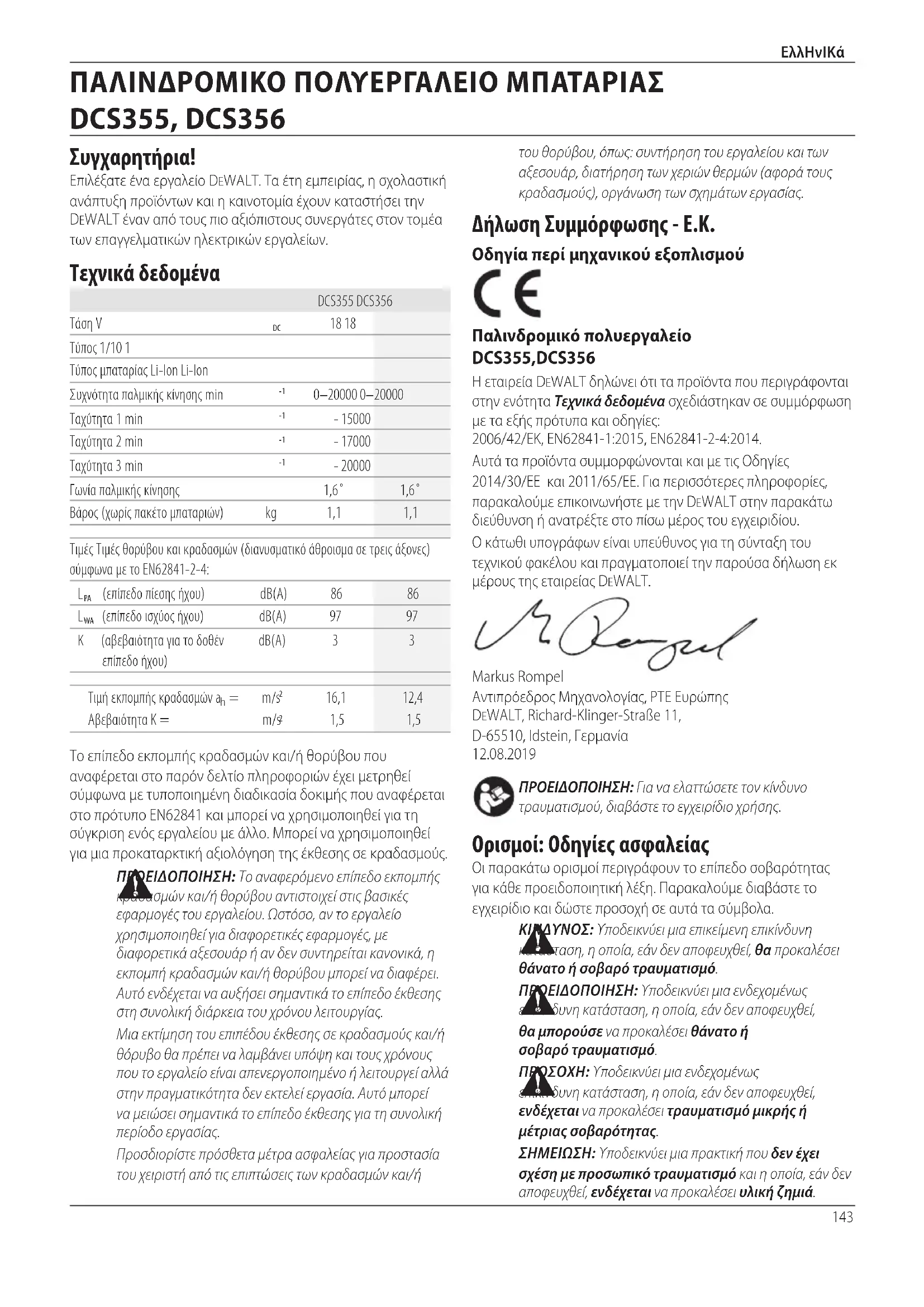 ΠΡΟΕΙΔΟΠΟΙΗΣΗ: Το αναφερόμενο επίπεδο εκπομπής κραδασμών και/ή θορύβου αντιστοιχεί στις βασικές εφαρμογές του εργαλείου. Ωστόσο, αν το εργαλείο χρησιμοποιηθεί για διαφορετικές εφαρμογές, με διαφορετικά αξεσουάρ ή αν δεν συντηρείται κανονικά, η εκπομπή κραδασμών και/ή θορύβου μπορεί να διαφέρει. Αυτό ενδέχεται να αυξήσει σημαντικά το επίπεδο έκθεσης στη συνολική διάρκεια του χρόνουλειτουργίας. Μια εκτίμηση του επιπέδου έκθεσης σε κραδασμούς και/ή θόρυβο θα πρέπει να λαμβάνει υπόψη και τους χρόνους που το εργαλείο είναι απενεργοποιημένο ή λειτουργεί αλλά στην πραγματικότητα δεν εκτελεί εργασία. Αυτό μπορεί να μειώσει σημαντικά το επίπεδο έκθεσης για τη συνολική περίοδοεργασίας. Προσδιορίστε πρόσθετα μέτρα ασφαλείας για προστασία του χειριστή από τις επιπτώσεις των κραδασμών και/ή του θορύβου, όπως: συντήρηση του εργαλείου και των αξεσουάρ, διατήρηση των χεριών θερμών (αφορά τους κραδασμούς), οργάνωση των σχημάτωνεργασίας. Δήλωση Συμμόρφωσης - Ε.Κ. Οδηγία περί μηχανικού εξοπλισμού Παλινδρομικό πολυεργαλείο DCS355, DCS356 Η εταιρεία DeWALT δηλώνει ότι τα προϊόντα που περιγράφονται στην ενότητα Τεχνικά δεδομένα σχεδιάστηκαν σε συμμόρφωση με τα εξής πρότυπα και οδηγίες: 2006/42/eK, EN62841-1:2015, EN62841-2-4:2014. Αυτά τα προϊόντα συμμορφώνονται και με τις Οδηγίες 2014/30/ΕΕ και 2011/65/ΕΕ. Για περισσότερες πληροφορίες, παρακαλούμε επικοινωνήστε με την DeWALT στην παρακάτω διεύθυνση ή ανατρέξτε στο πίσω μέρος τουεγχειριδίου. Ο κάτωθι υπογράφων είναι υπεύθυνος για τη σύνταξη του τεχνικού φακέλου και πραγματοποιεί την παρούσα δήλωση εκ μέρους της εταιρείαςDeWALT. Markus Rompel Αντιπρόεδρος Μηχανολογίας, PTE Ευρώπης DeWALT, Richard-Klinger-Straße 11, D-65510, Idstein, Γερμανία