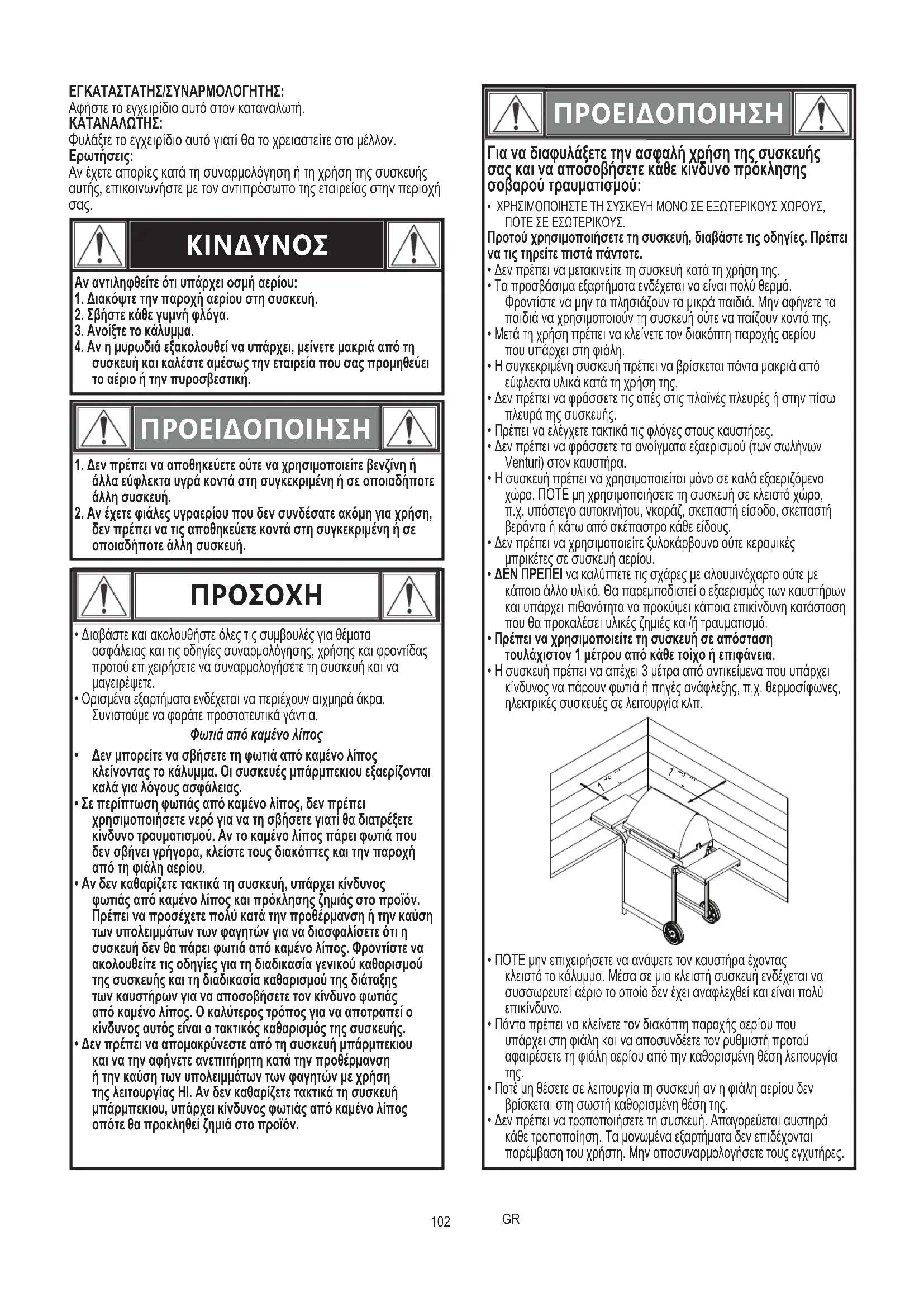 - Η συσκευή πρέπει να απέχει 3 μέτρα από αντικείμενα που υπάρχει κίνδυνος να πάρουν φωτιά ή πηγές ανάφλεξης, π.χ. θερμοσίφωνες, ηλεκτρικές συσκευές σε λειτουργία κλπ.
