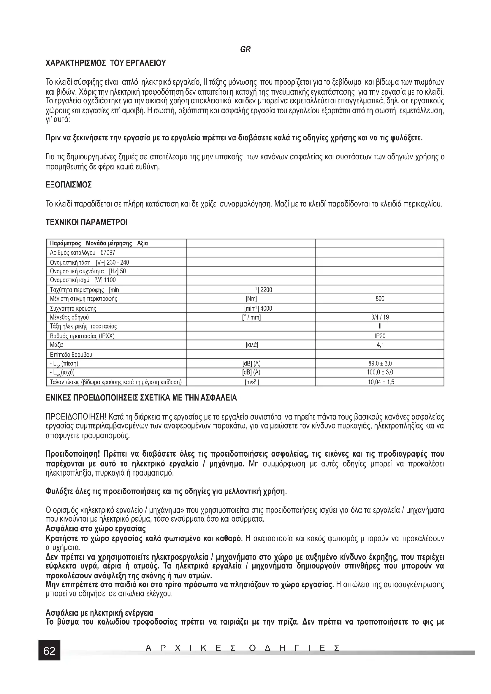 Το κλειδί παραδίδεται σε πλήρη κατάσταση και δε χρίζει συναρμολόγηση. Μαζί με το κλειδί παραδίδονται τα κλειδιά περικοχλίου. ΤΕΧΝΙΚΟΙ ΠΑΡΑΜΕΤΡΟΙ Παράμετρος Μονάδα μέτρησης Αξία Αριθμός καταλόγου 57097 Ονομαστική τάση [V~] 230 - 240 Ονομαστική συχνότητα [Hz] 50 Ονομαστική ισχύ [W] 1100 Ταχύτητα περιστροφής [min