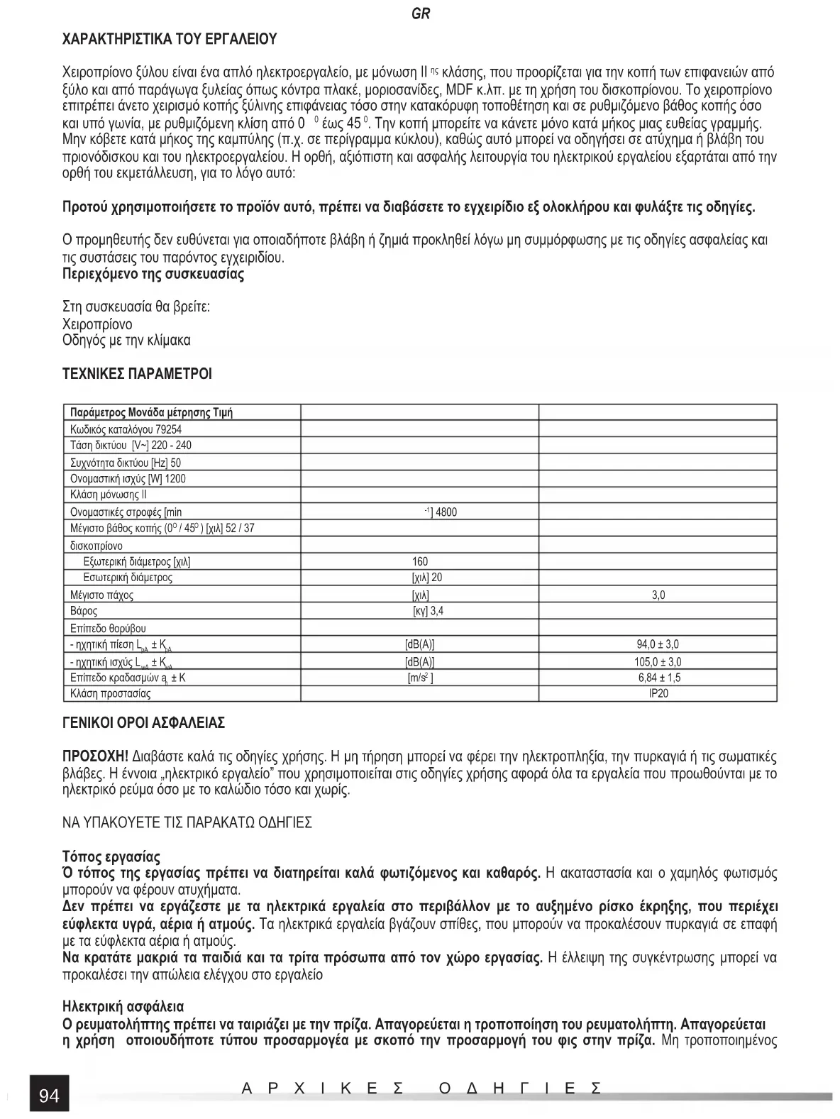 ] 6,84 ± 1,5 Κλάση προστασίας IP20 ΓΕΝΙΚΟΙ ΟΡΟΙ ΑΣΦΑΛΕΙΑΣ ΠΡΟΣΟΧΗ! Διαβάστε καλά τις οδηγίες χρήσης. Η μη τήρηση μπορεί να φέρει την ηλεκτροπληξία, την πυρκαγιά ή τις σωματικές βλάβες. Η έννοια „ηλεκτρικό εργαλείο” που χρησιμοποιείται στις οδηγίες χρήσης αφορά όλα τα εργαλεία που προωθούνται με το ηλεκτρικό ρεύμα όσο με το καλώδιο τόσο και χωρίς. ΝΑ ΥΠΑΚΟΥΕΤΕ ΤΙΣ ΠΑΡΑΚΑΤΩ ΟΔΗΓΙΕΣ Τόπος εργασίας Ό τόπος της εργασίας πρέπει να διατηρείται καλά φωτιζόμενος και καθαρός. Η ακαταστασία και ο χαμηλός φωτισμός μπορούν να φέρουν ατυχήματα. Δεν πρέπει να εργάζεστε με τα ηλεκτρικά εργαλεία στο περιβάλλον με το αυξημένο ρίσκο έκρηξης, που περιέχει εύφλεκτα υγρά, αέρια ή ατμούς. Τα ηλεκτρικά εργαλεία βγάζουν σπίθες, που μπορούν να προκαλέσουν πυρκαγιά σε επαφή με τα εύφλεκτα αέρια ή ατμούς. Να κρατάτε μακριά τα παιδιά και τα τρίτα πρόσωπα από τον χώρο εργασίας. Η έλλειψη της συγκέντρωσης μπορεί να προκαλέσει την απώλεια ελέγχου στο εργαλείο Ηλεκτρική ασφάλεια Ο ρευματολήπτης πρέπει να ταιριάζει με την πρίζα. Απαγορεύεται η τροποποίηση του ρευματολήπτη. Απαγορεύεται η χρήση οποιουδήποτε τύπου προσαρμογέα με σκοπό την προσαρμογή του φις στην πρίζα. Μη τροποποιημένος95