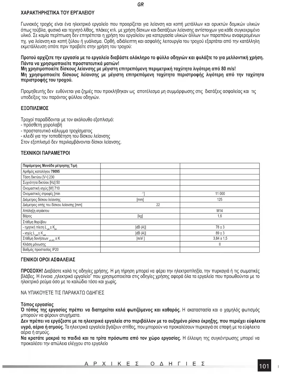 ΑΡΧΙΚΕΣ ΟΔΗΓΙΕΣ ΧΑΡΑΚΤΗΡΗΣΤΙΚΑ ΤΟΥ ΕΡΓΑΛΕΙΟΥ Γωνιακός τροχός είναι ένα ηλεκτρικό εργαλείο που προορίζεται για λείανση και κοπή μετάλλων και ορυκτών δομικών υλικών όπως τούβλα, φυσικό και τεχνητό λίθος, πλάκες κτλ. με χρήση δίσκων και διατάξεων λείανσης αντίστοιχων για κάθε συγκεκριμένο υλικό. Σε καμία περίπτωση δεν επιτρέπεται η χρήση του εργαλείου για κατεργασία υλικών άλλων των παραπάνω αναφερομένων πχ. για λείανση και κοπή ξύλου ή γυάλισμα. Ορθή, αδιάλειπτη και ασφαλής λειτουργία του τροχού εξαρτάται από την κατάλληλη εκμετάλλευση οπότε πριν προβείτε στην χρήση του τροχού: Προτού αρχίζετε την εργασία με το εργαλείο διαβάστε ολόκληρο το φύλλο οδηγιών και φυλάξτε το για μελλοντική χρήση. Πάντα να χρησιμοποιείτε προστατευτικά ματιών! Μη χρησιμοποιείτε δίσκους λείανσης με μέγιστη επιτρεπόμενη περιμετρική ταχύτητα λιγότερη από 80 m/s! Μη χρησιμοποιείτε δίσκους λείανσης με μέγιστη επιτρεπόμενη ταχύτητα περιστροφής λιγότερη από την ταχύτητα περιστροφής του τροχού. Προμηθευτής δεν ευθύνεται για ζημιές που προκλήθηκαν ως αποτέλεσμα μη συμμόρφωσης στις διατάξεις ασφαλείας και τις υποδείξεις του παρόντος φύλλου οδηγιών.