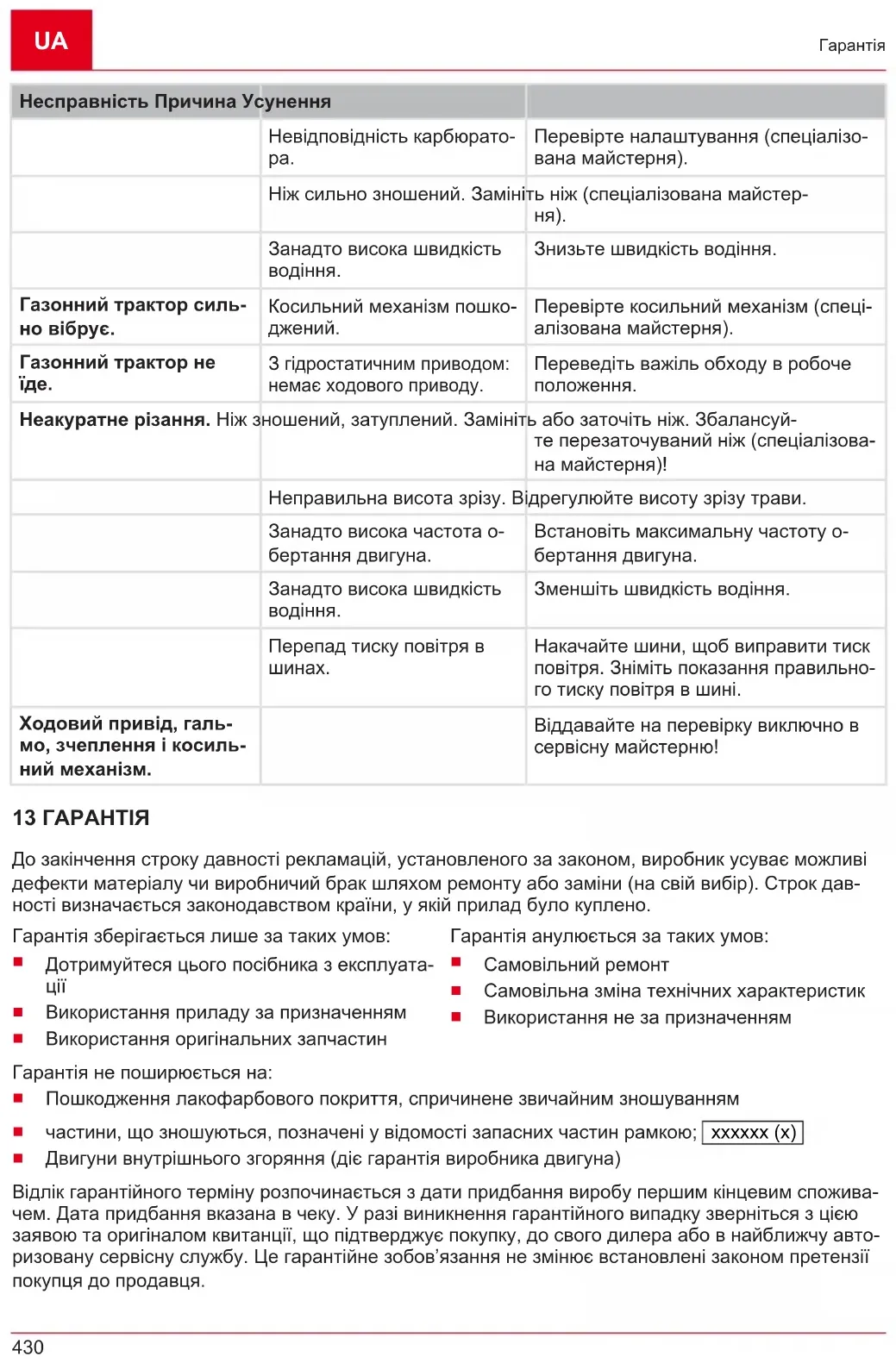 Μείωση ταχύτητας πορείας. Το χλοοκοπτικό τρακτέρ δονείται έντονα. Ο μηχανισμός κοπής είναι χαλασμένος. Έλεγχος μηχανισμού κοπής (συνεργείο εξυπηρέτησης πελατών).449