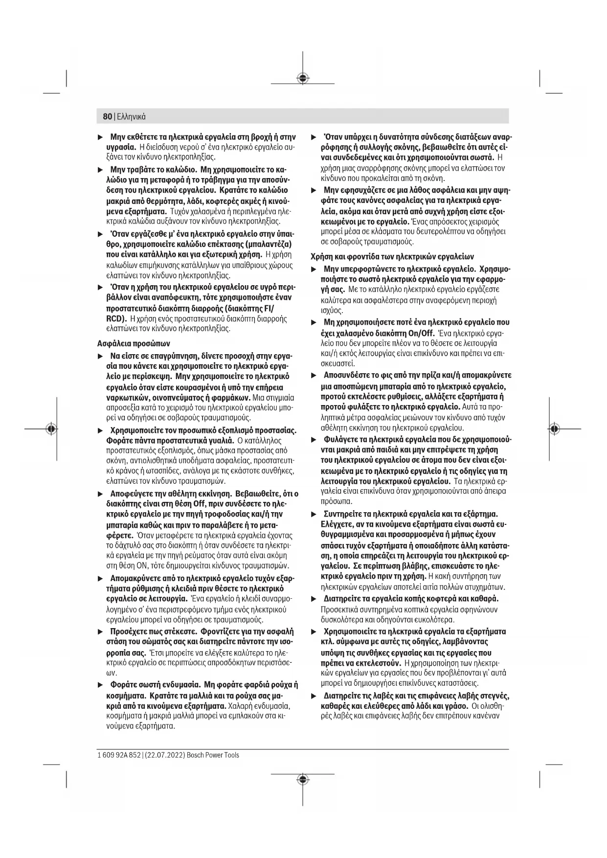 u Αποφεύγετε την επαφή του σώματός σας με γειωμένες επιφάνειες, όπως σωλήνες, θερμαντικά σώματα (καλο- ριφέρ), κουζίνες ή ψυγεία. Όταν το σώμα σας είναι γειω- μένο αυξάνεται ο κίνδυνος ηλεκτροπληξίας. Bosch Power Tools 1 609 92A 852 | (22.07.2022)80 | Ελληνικά u Μην εκθέτετε τα ηλεκτρικά εργαλεία στη βροχή ή στην υγρασία. Η διείσδυση νερού σ’ ένα ηλεκτρικό εργαλείο αυ- ξάνει τον κίνδυνο ηλεκτροπληξίας. u Μην τραβάτε το καλώδιο. Μη χρησιμοποιείτε το κα- λώδιο για τη μεταφορά ή το τράβηγμα για την αποσύν- δεση του ηλεκτρικού εργαλείου. Κρατάτε το καλώδιο μακριά από θερμότητα, λάδι, κοφτερές ακμές ή κινού- μενα εξαρτήματα. Τυχόν χαλασμένα ή περιπλεγμένα ηλε- κτρικά καλώδια αυξάνουν τον κίνδυνο ηλεκτροπληξίας. u Όταν εργάζεσθε μ’ ένα ηλεκτρικό εργαλείο στην ύπαι- θρο, χρησιμοποιείτε καλώδιο επέκτασης (μπαλαντέζα) που είναι κατάλληλο και για εξωτερική χρήση. Ηχρήση καλωδίων επιμήκυνσης κατάλληλων για υπαίθριους χώρους ελαττώνει τον κίνδυνο ηλεκτροπληξίας. u Όταν η χρήση του ηλεκτρικού εργαλείου σε υγρό περι- βάλλον είναι αναπόφευκτη, τότε χρησιμοποιήστε έναν προστατευτικό διακόπτη διαρροής (διακόπτηςFI/ RCD). Ηχρήση ενός προστατευτικού διακόπτη διαρροής ελαττώνει τον κίνδυνο ηλεκτροπληξίας. Ασφάλεια προσώπων u Να είστε σε επαγρύπνηση, δίνετε προσοχή στην εργα- σία που κάνετε και χρησιμοποιείτε το ηλεκτρικό εργα- λείο με περίσκεψη. Μην χρησιμοποιείτε το ηλεκτρικό εργαλείο όταν είστε κουρασμένοι ή υπό την επήρεια ναρκωτικών, οινοπνεύματος ή φαρμάκων. Μια στιγμιαία απροσεξία κατά το χειρισμό του ηλεκτρικού εργαλείου μπο- ρεί να οδηγήσει σε σοβαρούς τραυματισμούς. u Χρησιμοποιείτε τον προσωπικό εξοπλισμό προστασίας. Φοράτε πάντα προστατευτικά γυαλιά. Ο κατάλληλος προστατευτικός εξοπλισμός, όπως μάσκα προστασίας από σκόνη, αντιολισθητικά υποδήματα ασφαλείας, προστατευτι- κό κράνος ή ωτασπίδες, ανάλογα με τις εκάστοτε συνθήκες, ελαττώνει τον κίνδυνο τραυματισμών. u Αποφεύγετε την αθέλητη εκκίνηση. Βεβαιωθείτε, ότι ο διακόπτης είναι στη θέση Off, πριν συνδέσετε το ηλε- κτρικό εργαλείο με την πηγή τροφοδοσίας και/ή την μπαταρία καθώς και πριν το παραλάβετε ή το μετα- φέρετε. Όταν μεταφέρετε τα ηλεκτρικά εργαλεία έχοντας το δάχτυλό σας στο διακόπτη ή όταν συνδέσετε τα ηλεκτρι- κά εργαλεία με την πηγή ρεύματος όταν αυτά είναι ακόμη στη θέση ΟΝ, τότε δημιουργείται κίνδυνος τραυματισμών. u Απομακρύνετε από το ηλεκτρικό εργαλείο τυχόν εξαρ- τήματα ρύθμισης ή κλειδιά πριν θέσετε το ηλεκτρικό εργαλείο σε λειτουργία. Ένα εργαλείο ή κλειδί συναρμο- λογημένο σ’ ένα περιστρεφόμενο τμήμα ενός ηλεκτρικού εργαλείου μπορεί να οδηγήσει σε τραυματισμούς. u Προσέχετε πως στέκεστε. Φροντίζετε για την ασφαλή στάση του σώματός σας και διατηρείτε πάντοτε την ισο- ρροπία σας. Έτσι μπορείτε να ελέγξετε καλύτερα το ηλε- κτρικό εργαλείο σε περιπτώσεις απροσδόκητων περιστάσε-