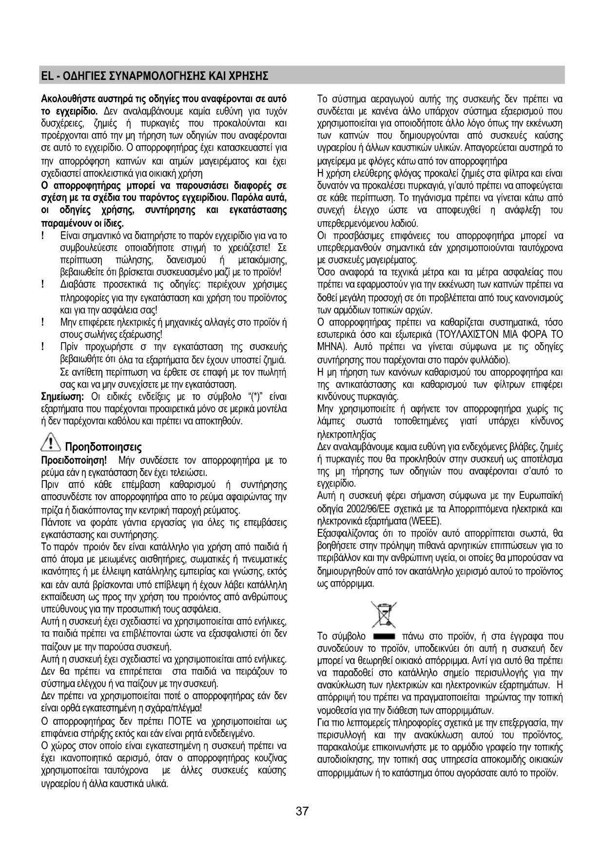 όσο και εξωτερικά (ΤΟΥΛΑΧΙΣΤΟΝ ΜΙΑ ΦΟΡΑ ΤΟ ΜΗΝΑ). Αυτό πρέπει να γίνεται σύμφωνα με τις οδηγίες συντήρησης που παρέχονται στο παρόν φυλλάδιο). Η μη τήρηση των κανόνων καθαρισμού του απορροφητήρα και της αντικατάστασης και καθαρισμού των φίλτρων επιφέρει κινδύνους πυρκαγιάς. Μην χρησιμοποιείτε ή αφήνετε τον απορροφητήρα χωρίς τις λάμπες σωστά τοποθετημένες γιατί υπάρχει κίνδυνος ηλεκτροπληξίας Δεν αναλαμβάνουμε καμια ευθύνη για ενδεχόμενες βλάβες, ζημιές ή πυρκαγιές που θα προκληθούν στην συσκευή ως αποτέλσμα της μη τήρησης των οδηγιών που αναφέρονται σ’αυτό το εγχειρίδιο. Αυτή η συσκευή φέρει σήμανση σύμφωνα με την Ευρωπαϊκή οδηγία 2002/96/ΕΕ σχετικά με τα Απορριπτόμενα ηλεκτρικά και ηλεκτρονικά εξαρτήματα (WEEE). Εξασφαλίζοντας ότι το προϊόν αυτό απορρίπτεται σωστά, θα βοηθήσετε στην πρόληψη πιθανά αρνητικών επιπτώσεων για το περιβάλλον και την ανθρώπινη υγεία, οι οποίες θα μπορούσαν να δημιουργηθούν από τον ακατάλληλο χειρισμό αυτού το προϊόντος ως απόρριμμα.