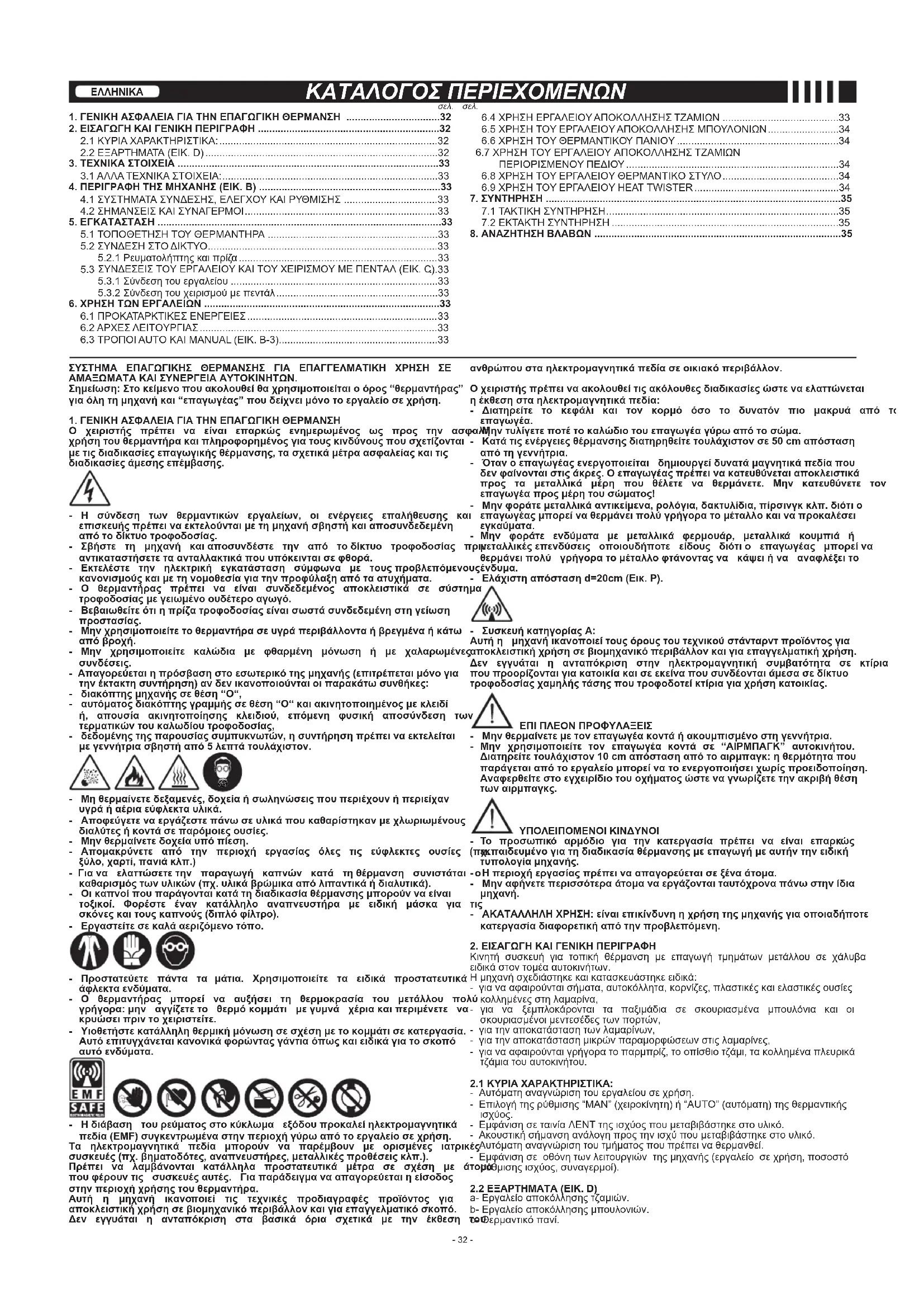 ΣΥΣΤΗΜΑ ΕΠΑΓΩΓΙΚΗΣ ΘΕΡΜΑΝΣΗΣ ΓΙΑ ΕΠΑΓΓΕΛΜΑΤΙΚΗ ΧΡΗΣΗ ΣΕ ΑΜΑΞΩΜΑΤΑΚΑΙΣΥΝΕΡΓΕΙΑΑΥΤΟΚΙΝΗΤΩΝ. Σημείωση:Στοκείμενοπουακολουθείθαχρησιμοποιείταιοόρος“θερμαντήρας” γιαόλητημηχανήκαι“επαγωγέας”πουδείχνειμόνοτοεργαλείοσεχρήση. 1.ΓΕΝΙΚΗΑΣΦΑΛΕΙΑΓΙΑΤΗΝΕΠΑΓΩΓΙΚΗΘΕΡΜΑΝΣΗ Ο χειριστής πρέπει να είναι επαρκώς ενημερωμένος ως προς την ασφαλή χρήσητουθερμαντήρακαιπληροφορημένοςγιατουςκινδύνουςπουσχετίζονται μετιςδιαδικασίεςεπαγωγικήςθέρμανσης,τασχετικάμέτραασφαλείαςκαιτις διαδικασίεςάμεσηςεπέμβασης. - Η σύνδεση των θερμαντικών εργαλείων, οι ενέργειες επαλήθευσης και επισκευήςπρέπειναεκτελούνταιμετημηχανήσβηστήκαιαποσυνδεδεμένη απότοδίκτυοτροφοδοσίας. - Σβήστε τη μηχανή καιαποσυνδέστε την από τοδίκτυο τροφοδοσίας πριν αντικαταστήσετεταανταλλακτικάπουυπόκεινταισεφθορά. - Εκτελέστε την ηλεκτρική εγκατάσταση σύμφωνα με τουςπροβλεπόμενους κανονισμούςκαιμετηνομοθεσίαγιατηνπροφύλαξηαπόταατυχήματα. - Ο θερμαντήρας πρέπει να είναι συνδεδεμένος αποκλειστικά σε σύστημα τροφοδοσίαςμεγειωμένοουδέτεροαγωγό. - Βεβαιωθείτεότιηπρίζατροφοδοσίαςείναισωστάσυνδεδεμένηστηγείωση προστασίας. - Μηνχρησιμοποιείτετοθερμαντήρασευγράπεριβάλλονταήβρεγμέναήκάτω