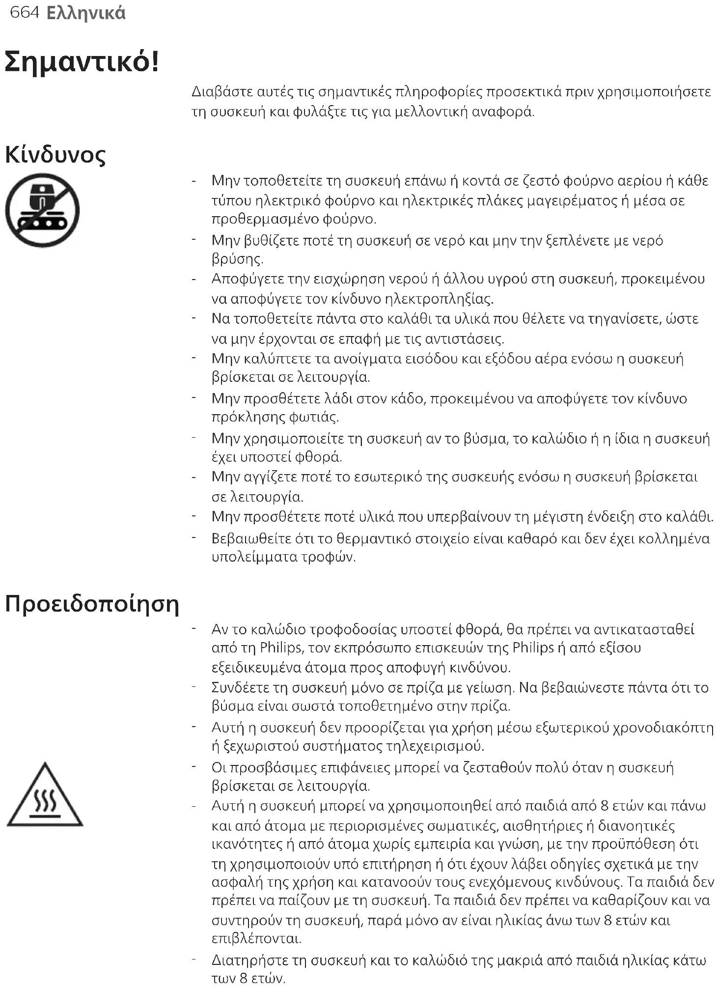 Αυτό είναι φυσιολογικό. Όλες οι λαβές και οι διακόπτες που πρέπει να αγγίξετε κατά τη χρήση παραμένουν αρκετά κρύα, ώστε να μπορείτε να τα πιάσετε. Ο κάδος, το καλάθι και το εσωτερικό της συσκευής θερμαίνονται πάντα όταν η συσκευή είναι ενεργοποιημένη, ώστε να μαγειρεύεται σωστά το φαγητό. Αυτά τα μέρη είναι πάντα πολύ ζεστά για να τα αγγίξετε. Αν αφήσετε ενεργοποιημένη τη συσκευή για μεγαλύτερο διάστημα, ορισμένα σημεία της θερμαίνονται υπερβολικά για να τα αγγίξετε. Τα σημεία αυτά επισημαίνονται στη συσκευή με το εξής εικονίδιο: Από τη στιγμή που γνωρίζετε αυτά τα ζεστά σημεία και δεν τα αγγίζετε, η συσκευή είναι απολύτως ασφαλής για χρήση.690