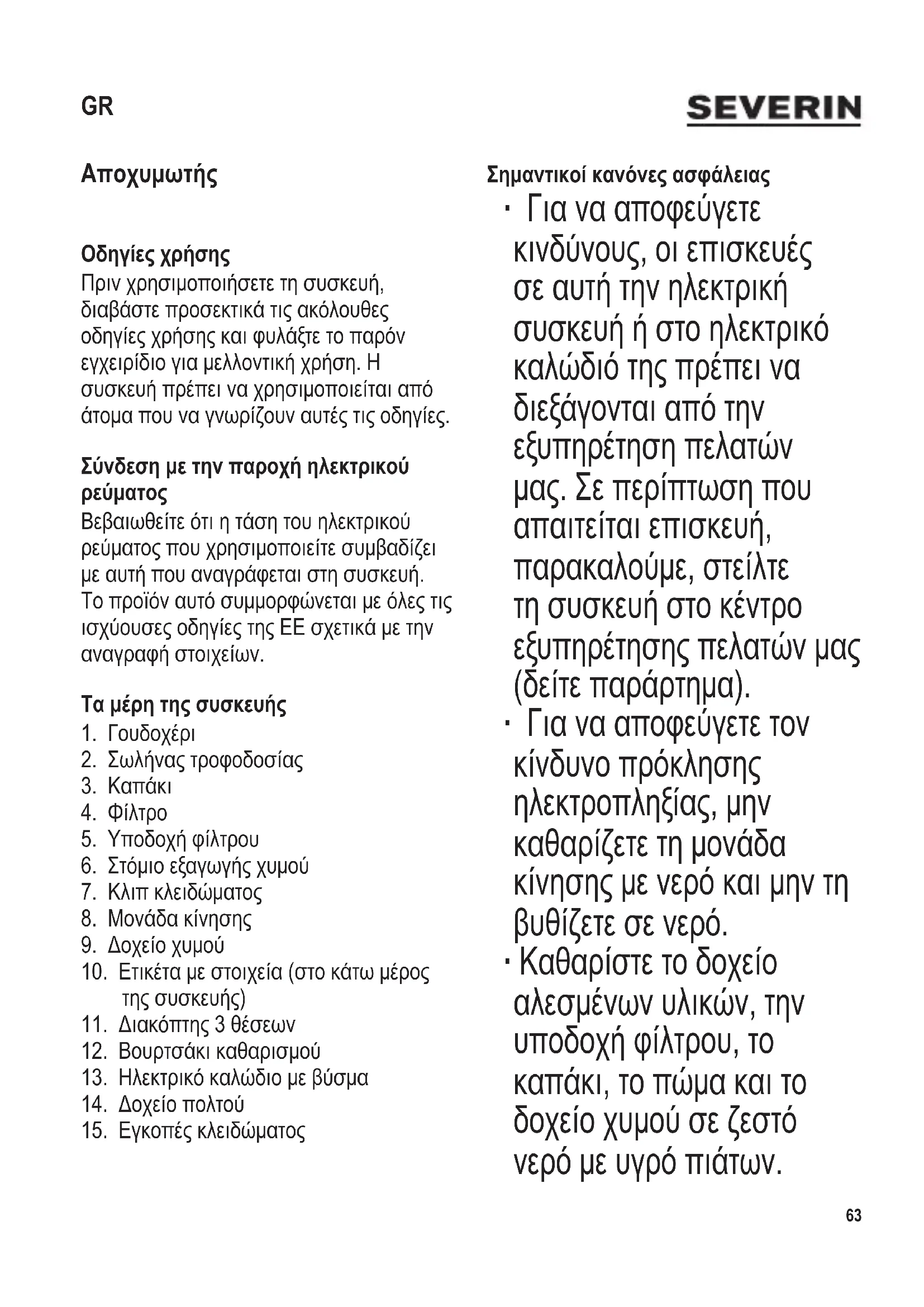 Κατεβάστε τις οδηγίες για το αποχυμωτής σε μορφή PDF δωρεάν! Βρείτε το εγχειρίδιό σας CP 3566 - SEVERIN και πάρτε ξανά την ηλεκτρονική σας συσκευή στα χέρια σας. Σε αυτή τη σελίδα δημοσιεύονται όλα τα έγγραφα που απαιτούνται για τη χρήση της συσκευής σας. CP 3566 της μάρκας SEVERIN.