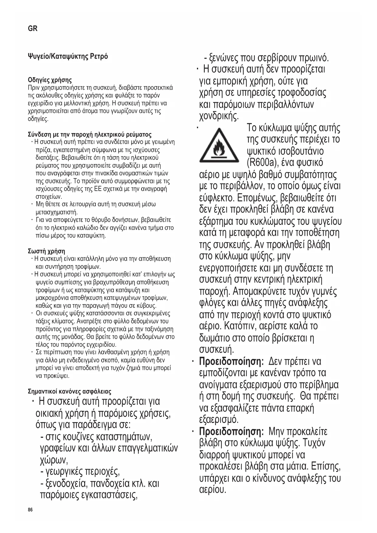 ∙ Προειδοποίηση: Μην προκαλείτε βλάβη στο κύκλωμα ψύξης. Τυχόν διαρροή ψυκτικού μπορεί να προκαλέσει βλάβη στα μάτια. Επίσης, υπάρχει και ο κίνδυνος ανάφλεξης του αερίου.87 142 x 208 mm ∙ Προειδοποίηση: Μη χρησιμοποιείτε καμία εξωτερική συσκευή (π.χ. καλοριφέρ ή αερόθερμα) για να επιταχύνετε την απόψυξη. Ακολουθήστε μόνο τις μεθόδους που συνιστώνται στο παρόν εγχειρίδιο. ∙ Προειδοποίηση: Μη θέτετε σε λειτουργία καμιά άλλη ηλεκτρική συσκευή (π.χ. συσκευές παραγωγής παγακιών) μέσα στον καταψύκτη εκτός εάν εγκρίνεται ειδικά σε αυτό το εγχειρίδιο. ∙ Πριν συνδέσετε τη συσκευή στην κεντρική ηλεκτρική παροχή, πρέπει να ελέγξετε προσεκτικά αυτήν και το ηλεκτρικό καλώδιό της για τυχόν βλάβη που προκλήθηκε κατά τη μεταφορά. Σε περίπτωση που εντοπιστεί βλάβη, η συσκευή δεν θα πρέπει να συνδεθεί στην κεντρική ηλεκτρική παροχή. ∙ Κατά την διάρκεια σύνδεσης της συσκευής, εξασφαλίστε ότι το καλώδιο τροφοδοσίας δεν έχει παγιδευτεί ή τραυματιστεί. ∙ Μην τοποθετείτε πολύπριζο ή άλλα τροφοδοτικά πίσω από την συσκευή