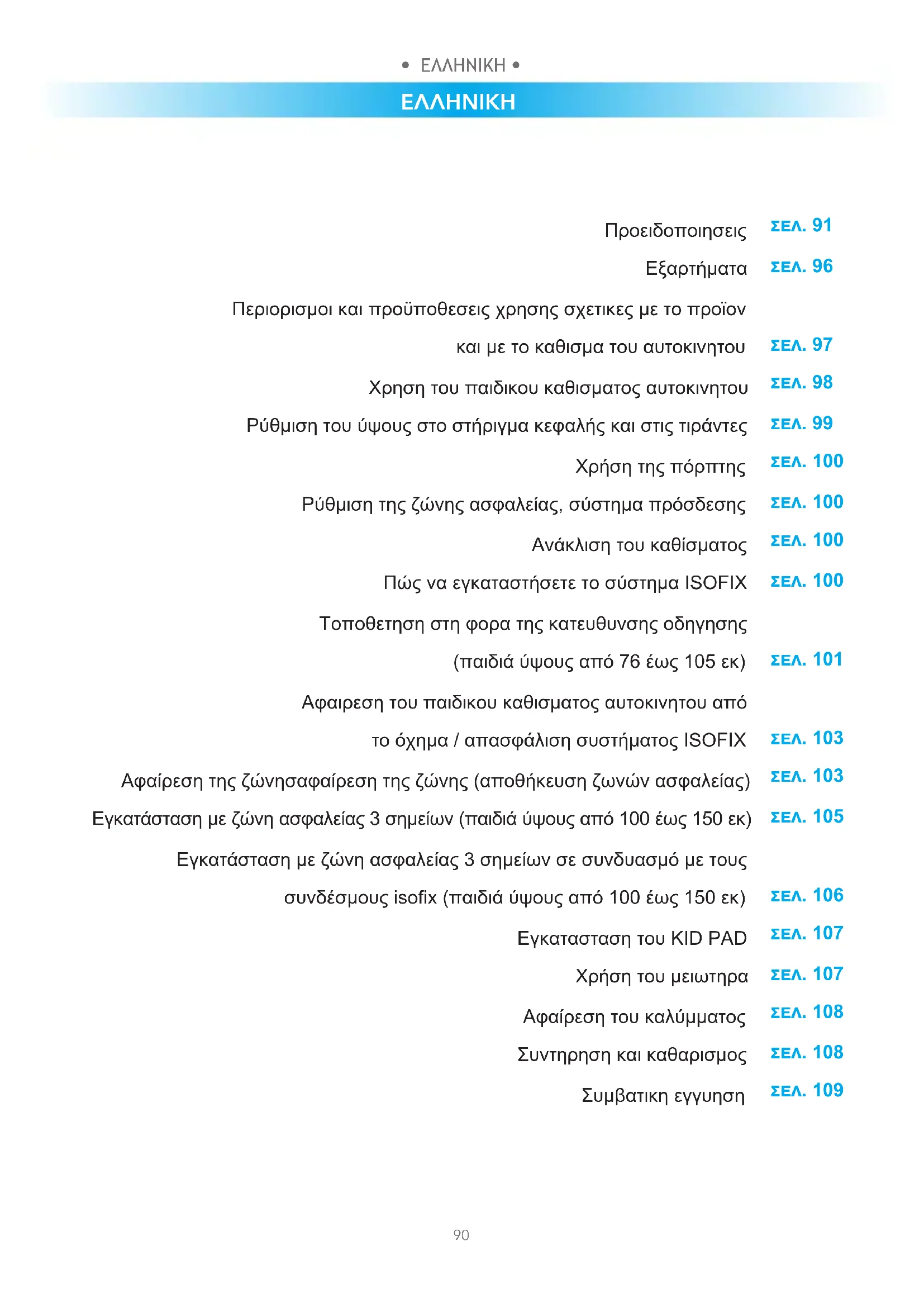 Περιορισμοι και προϋποθεσεις χρησης σχετικες με το προϊον και με το καθισμα του αυτοκινητου Χρηση του παιδικου καθισματος αυτοκινητου Ρύθμιση του ύψους στο στήριγμα κεφαλής και στις τιράντες Χρήση της πόρπτης Ρύθμιση της ζώνης ασφαλείας, σύστημα πρόσδεσης Ανάκλιση του καθίσματος Πώς να εγκαταστήσετε το σύστημα ISOFIX Τοποθετηση στη φορα της κατευθυνσης οδηγησης (παιδιά ύψους από 76 έως 105 εκ) Αφαιρεση του παιδικου καθισματος αυτοκινητου από το όχημα / απασφάλιση συστήματος ISOFIX Αφαίρεση της ζώνησαφαίρεση της ζώνης (αποθήκευση ζωνών ασφαλείας) Εγκατάσταση με ζώνη ασφαλείας 3 σημείων (παιδιά ύψους από 100 έως 150 εκ) Εγκατάσταση με ζώνη ασφαλείας 3 σημείων σε συνδυασμό με τους συνδέσμους isox (παιδιά ύψους από 100 έως 150 εκ) Εγκατασταση του KID PAD Χρήση του μειωτηρα Αφαίρεση του καλύμματος Συντηρηση και καθαρισμος Συμβατικη εγγυηση• ΕΛΛΗΝΙΚΗ •