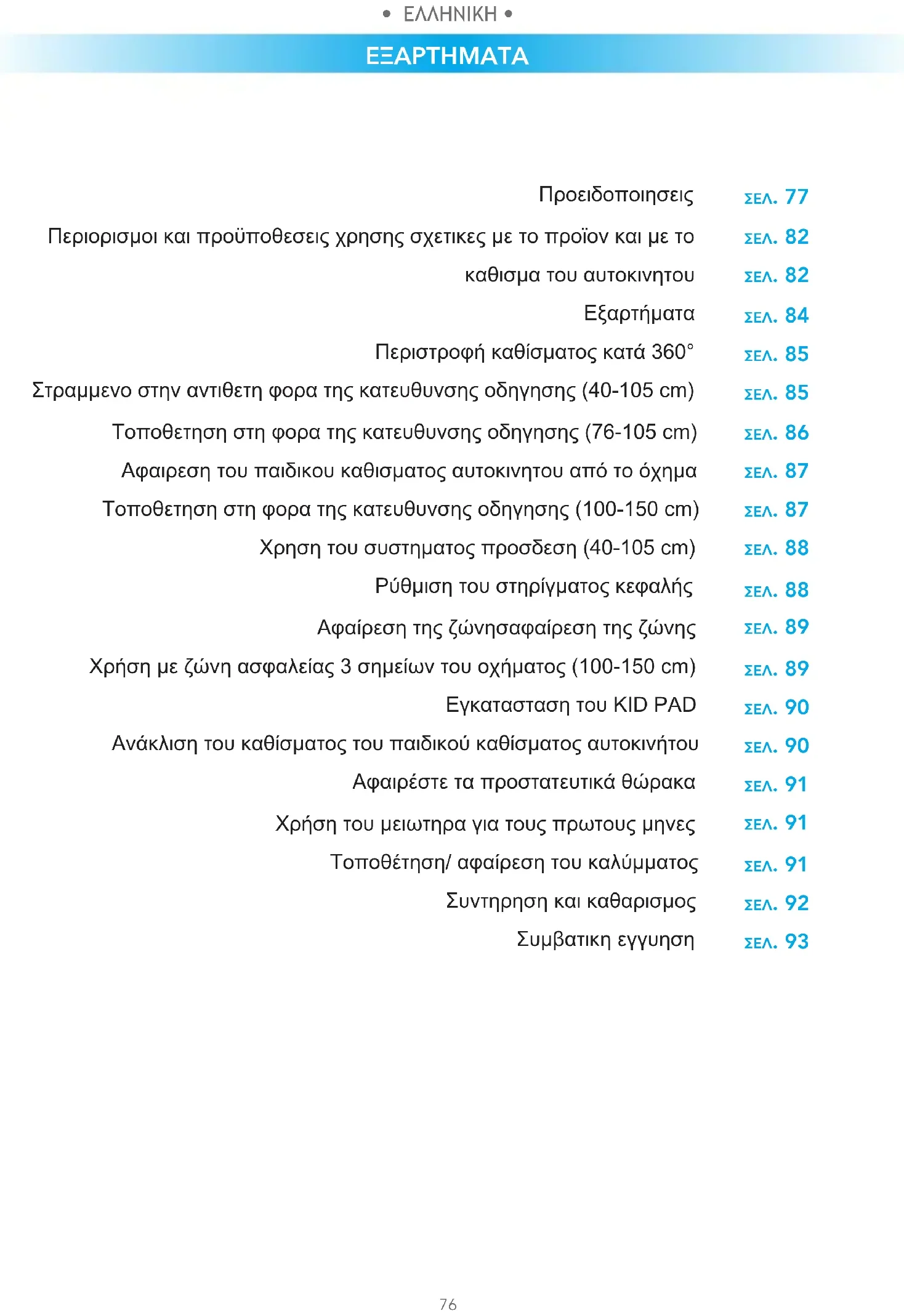 σελ. 77 σελ. 82 σελ. 82 σελ. 84 σελ. 85 σελ. 85 σελ. 86 σελ. 87 σελ. 87 σελ. 88 σελ. 88 σελ. 89 σελ. 89 σελ. 90 σελ. 90 σελ. 91 σελ. 91 σελ. 91 σελ. 92 σελ. 93 Προειδοποιησεις Περιορισμοι και προϋποθεσεις χρησης σχετικες με το προϊον και με το καθισμα του αυτοκινητου