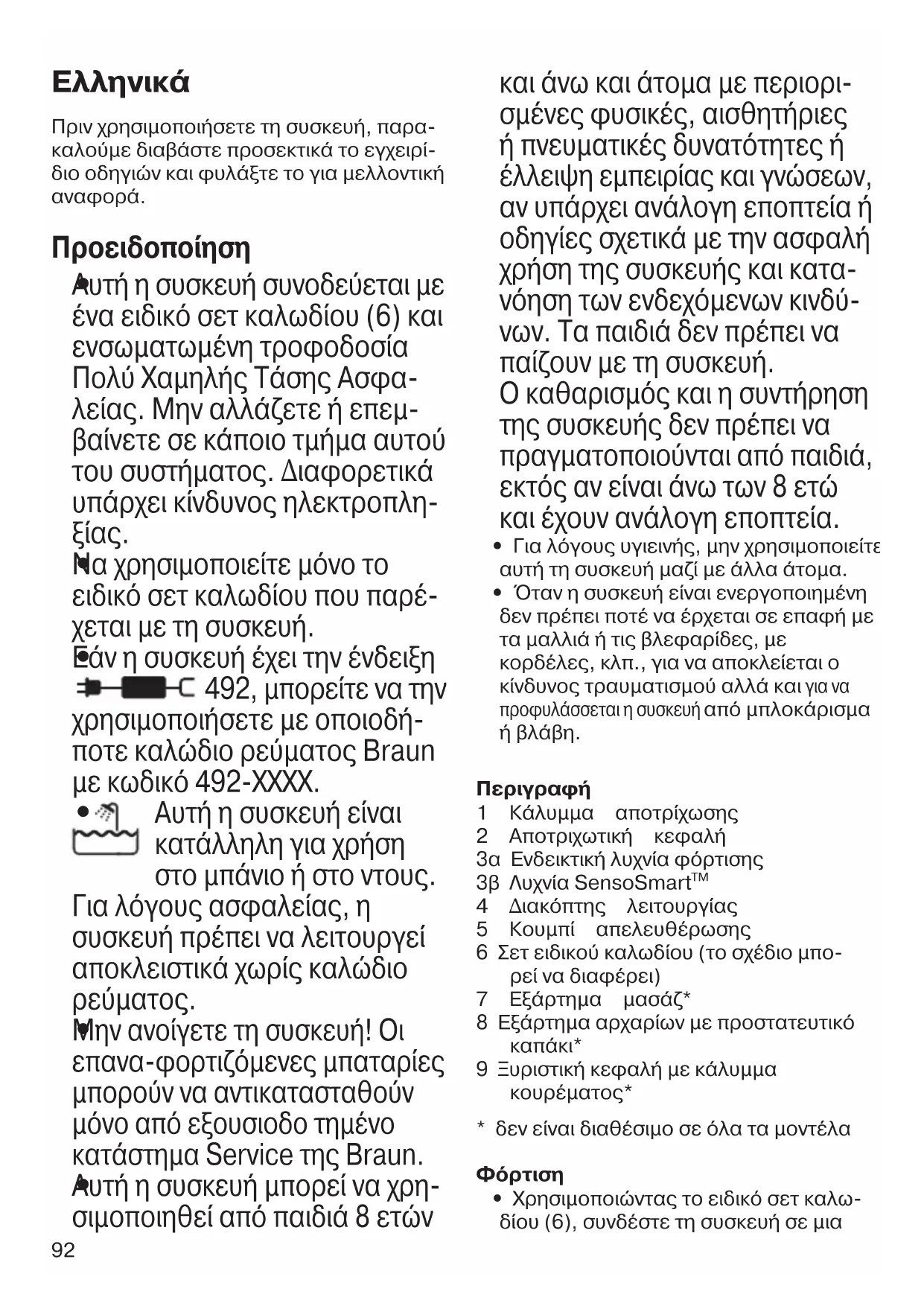 Εάν η συσκευή έχει την ένδειξη 492, μπορείτε να την χρησιμοποιήσετε με οποιοδή- ποτε καλώδιο ρεύματος Braun με κωδικό 492-ΧΧΧΧ.