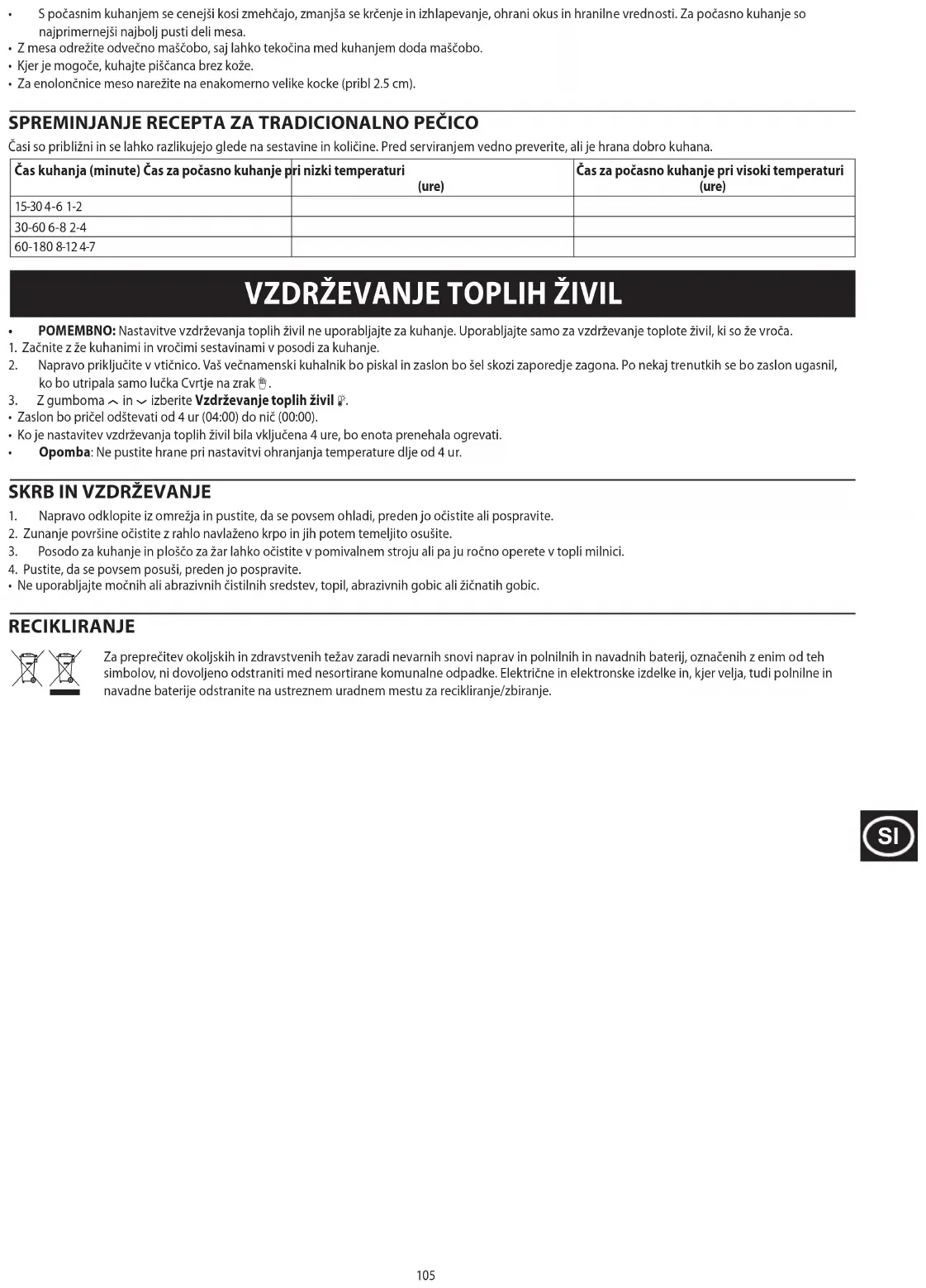 - Απομακρύνετε την περίσσεια του λίπους από το κρέας, καθώς αυτό μπορεί να προστεθεί στο υγρό κατά τη διάρκεια του μαγειρέματος, με τη μορφή λίπους. • Όπου είναι εφικτό, χρησιμοποιήστε κοτόπουλο χωρίς το δέρμα. • Κόψτε το κρέας σε ομοιόμορφου μεγέθους κύβους (περ. 2,5 cm) για ψητό φούρνου και σούπα. ΜΕΤΑΤΡΟΠΗ ΣΥΝΤΑΓΩΝ ΑΠΟ ΕΝΑΝ ΣΥΜΒΑΤΙΚΟ ΦΟΥΡΝΟ Αυτοί οι χρόνοι αναφέρονται κατά προσέγγιση και ενδέχεται να διαφέρουν ανάλογα με τα συστατικά και τις ποσότητες. Να ελέγχετε πάντα εάν το τρόφιμο είναι καλά μαγειρεμένο προτού το σερβίρετε.Χρόνος μαγειρέματος στον φούρνο (λεπτά) Χρόνος για αργό μαγείρεμα σε χαμηλή ένταση (ώρες)Χρόνος για αργό μαγείρεμα σε υψηλή ένταση (ώρες)15-30 4-6 1-230-60 6-8 2-460-180 8-12 4-7 ΔΙΑΤΗΡΗΣΗ ΘΕΡΜΟΚΡΑΣΙΑΣ