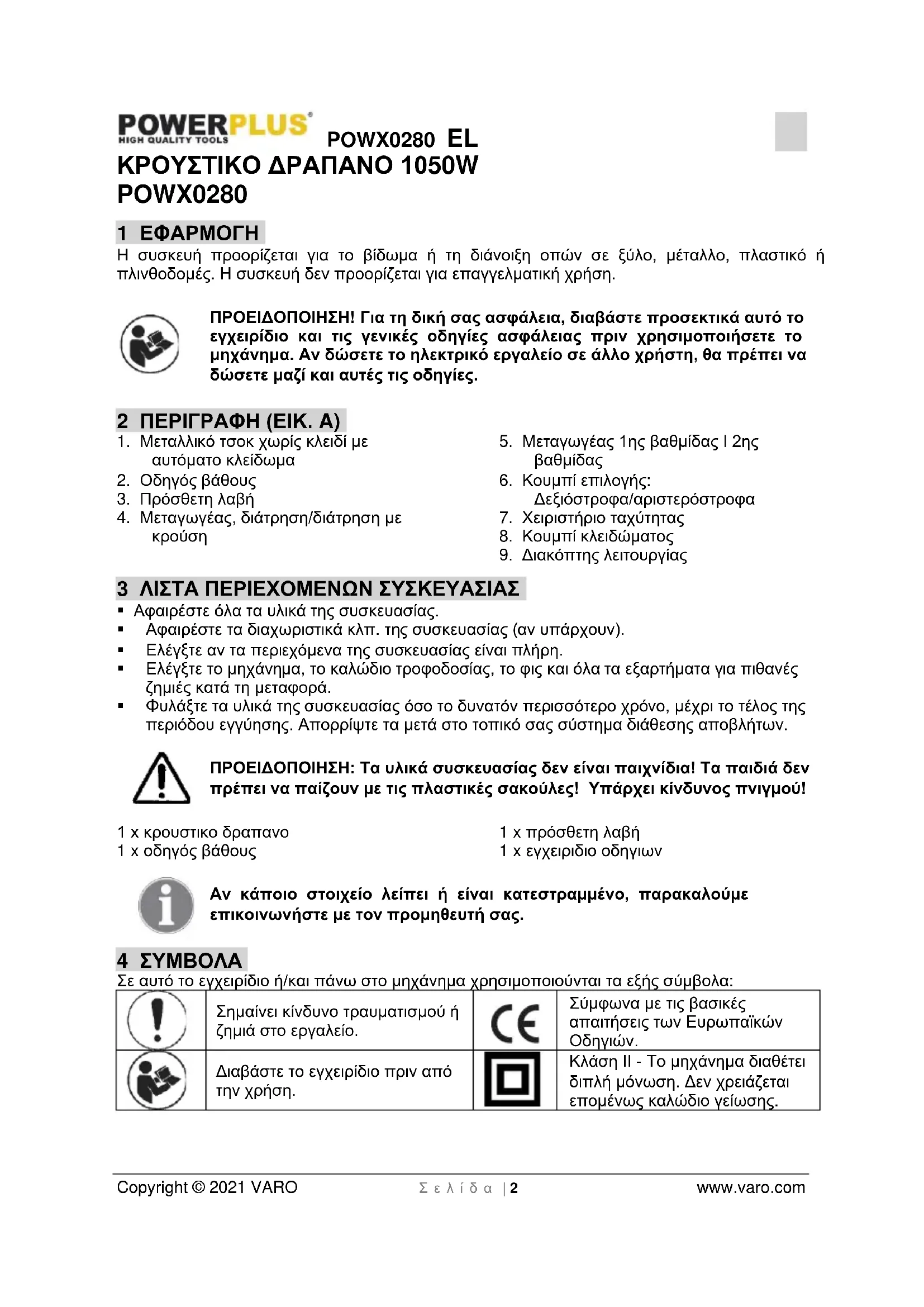 - 13 ΗΛΩΣΗ ΣΥΜΜΟΡΦΩΣΗΣ POWX0280 EL Copyright © 2021 VARO Σ ε λ ί δ α | 2 www.varo.com ΚΡΟΥΣΤΙΚΟ ΔΡΑΠΑΝΟ 1050W POWX0280 1 ΕΦΑΡΜΟΓΗ Η συσκευή προορίζεται για το βίδωμα ή τη διάνοιξη οπών σε ξύλο, μέταλλο, πλαστικό ή πλινθοδομές. Η συσκευή δεν προορίζεται για επαγγελματική χρήση. ΠΡΟΕΙΔΟΠΟΙΗΣΗ! Για τη δική σας ασφάλεια, διαβάστε προσεκτικά αυτό το εγχειρίδιο και τις γενικές οδηγίες ασφάλειας πριν χρησιμοποιήσετε το μηχάνημα. Αν δώσετε το ηλεκτρικό εργαλείο σε άλλο χρήστη, θα πρέπει να δώσετε μαζί και αυτές τις οδηγίες. 2 ΠΕΡΙΓΡΑΦΗ (ΕΙΚ. A) p. 9