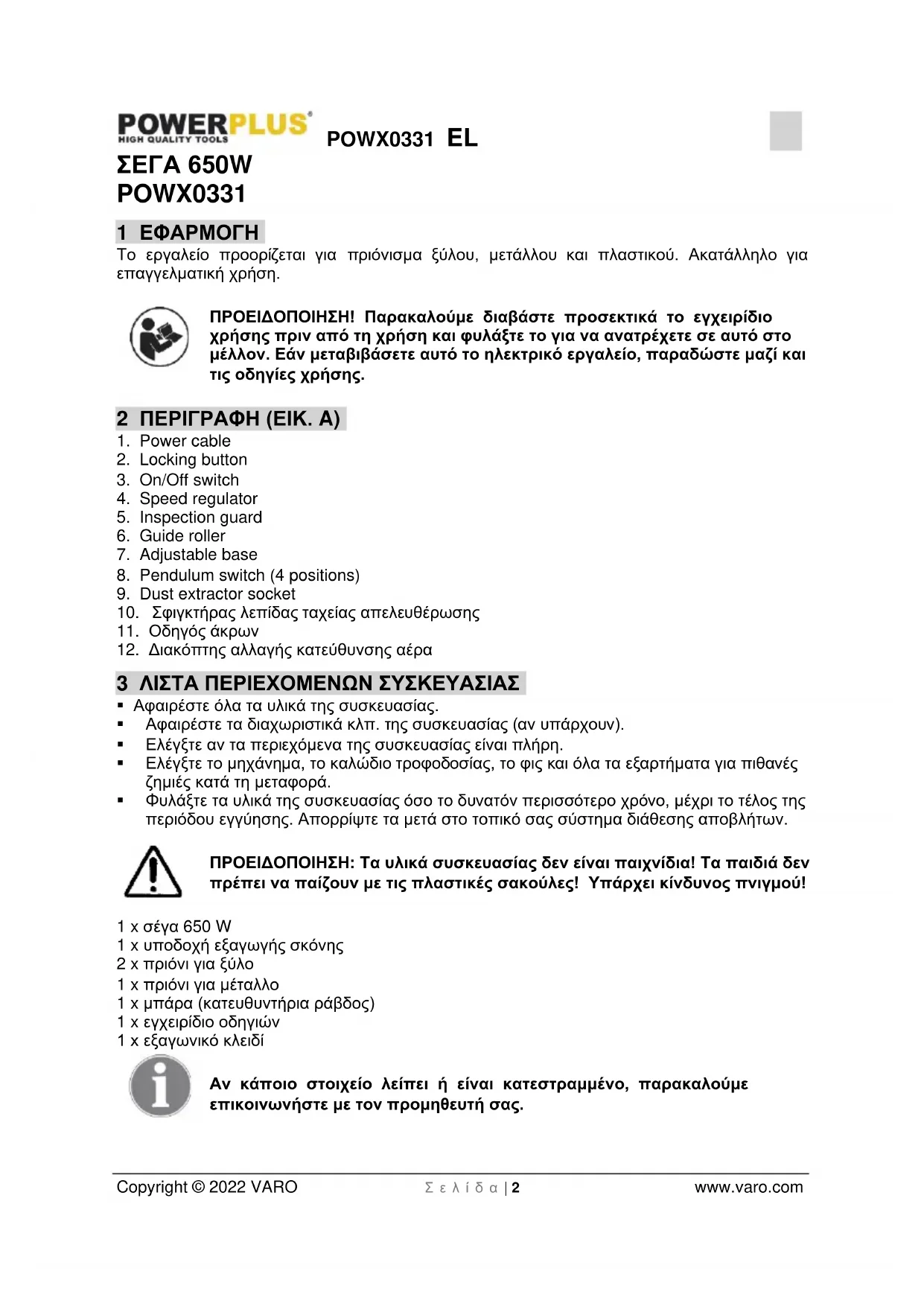 - 12 ΔΗΛΩΣΗ ΣΥΜΜΟΡΦΩΣΗΣ POWX0331 EL Copyright © 2022 VARO Σ ε λ ί δ α | 2 www.varo.com ΣΕΓΑ 650W POWX0331 1 ΕΦΑΡΜΟΓΗ Το εργαλείο προορίζεται για πριόνισμα ξύλου, μετάλλου και πλαστικού. Ακατάλληλο για επαγγελματική χρήση. ΠΡΟΕΙΔΟΠΟΙΗΣΗ! Παρακαλούμε διαβάστε προσεκτικά το εγχειρίδιο χρήσης πριν από τη χρήση και φυλάξτε το για να ανατρέχετε σε αυτό στο μέλλον. Εάν μεταβιβάσετε αυτό το ηλεκτρικό εργαλείο, παραδώστε μαζί και τις οδηγίες χρήσης. 2 ΠΕΡΙΓΡΑΦΗ (ΕΙΚ. A) p. 9