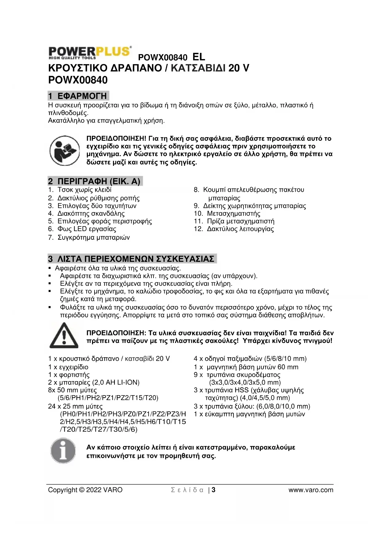 - 14 ΔΗΛΩΣΗ ΣΥΜΜΟΡΦΩΣΗΣ POWX00840 EL Copyright © 2022 VARO Σ ε λ ί δ α | 3 www.varo.com ΚΡΟΥΣΤΙΚΟ ΔΡΑΠΑΝΟ / ΚΑΤΣΑΒΙΔΙ 20 V POWX00840 1 ΕΦΑΡΜΟΓΗ Η συσκευή προορίζεται για το βίδωμα ή τη διάνοιξη οπών σε ξύλο, μέταλλο, πλαστικό ή πλινθοδομές. Ακατάλληλο για επαγγελματική χρήση. ΠΡΟΕΙΔΟΠΟΙΗΣΗ! Για τη δική σας ασφάλεια, διαβάστε προσεκτικά αυτό το εγχειρίδιο και τις γενικές οδηγίες ασφάλειας πριν χρησιμοποιήσετε το μηχάνημα. Αν δώσετε το ηλεκτρικό εργαλείο σε άλλο χρήστη, θα πρέπει να δώσετε μαζί και αυτές τις οδηγίες. 2 ΠΕΡΙΓΡΑΦΗ (ΕΙΚ. A) p. 13