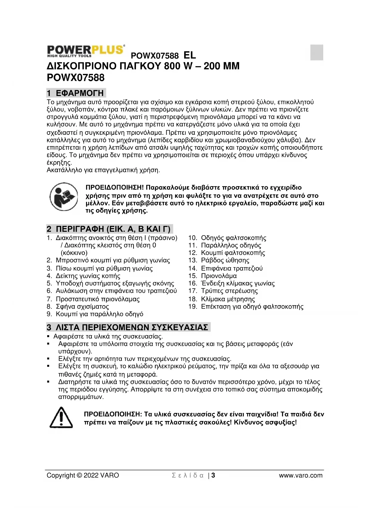 - 16 ΔΗΛΩΣΗ ΣΥΜΜΟΡΦΩΣΗΣ POWX07588 EL Copyright © 2022 VARO Σ ε λ ί δ α | 3 www.varo.com ΔΙΣΚΟΠΡΙΟΝΟ ΠΑΓΚΟΥ 800 W – 200 MM POWX07588 1 ΕΦΑΡΜΟΓΗ Το μηχάνημα αυτό προορίζεται για σχίσιμο και εγκάρσια κοπή στερεού ξύλου, επικολλητού ξύλου, νοβοπάν, κόντρα πλακέ και παρόμοιων ξύλινων υλικών. Δεν πρέπει να πριονίζετε στρογγυλά κομμάτια ξύλου, γιατί η περιστρεφόμενη πριονόλαμα μπορεί να τα κάνει να κυλήσουν. Με αυτό το μηχάνημα πρέπει να κατεργάζεστε μόνο υλικά για τα οποία έχει σχεδιαστεί η συγκεκριμένη πριονόλαμα. Πρέπει να χρησιμοποιείτε μόνο πριονόλαμες κατάλληλες για αυτό το μηχάνημα (λεπίδες καρβιδίου και χρωμιοβαναδιούχου χάλυβα). Δεν επιτρέπεται η χρήση λεπίδων από ατσάλι υψηλής ταχύτητας και τροχών κοπής οποιουδήποτε είδους. Το μηχάνημα δεν πρέπει να χρησιμοποιείται σε περιοχές όπου υπάρχει κίνδυνος p. 15