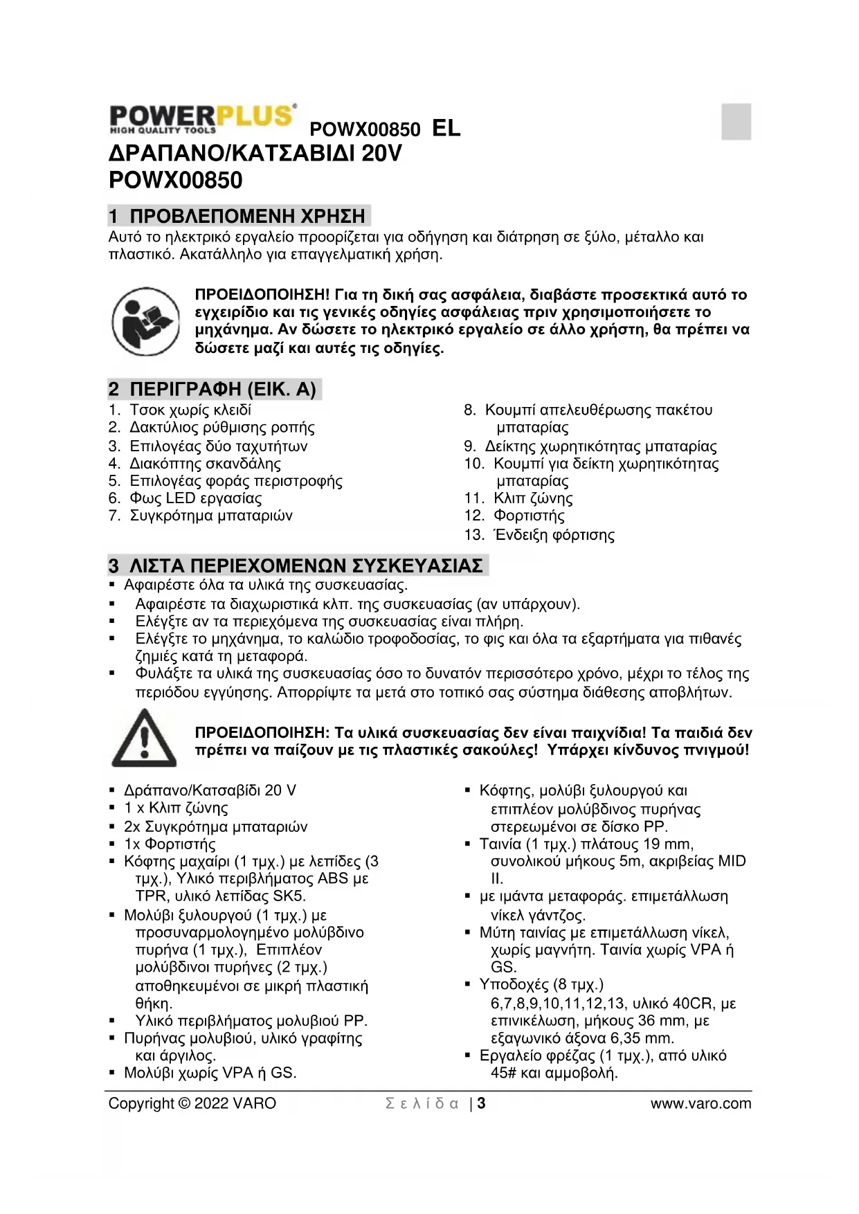 - 15 ΔΗΛΩΣΗ ΣΥΜΜΟΡΦΩΣΗΣ POWX00850 EL Copyright © 2022 VARO Σ ε λ ί δ α | 3 www.varo.com ΔΡΑΠΑΝΟ/ΚΑΤΣΑΒΙΔΙ 20V POWX00850 1 ΠΡΟΒΛΕΠΟΜΕΝΗ ΧΡΗΣΗ Αυτό το ηλεκτρικό εργαλείο προορίζεται για οδήγηση και διάτρηση σε ξύλο, μέταλλο και πλαστικό. Ακατάλληλο για επαγγελματική χρήση. ΠΡΟΕΙΔΟΠΟΙΗΣΗ! Για τη δική σας ασφάλεια, διαβάστε προσεκτικά αυτό το εγχειρίδιο και τις γενικές οδηγίες ασφάλειας πριν χρησιμοποιήσετε το μηχάνημα. Αν δώσετε το ηλεκτρικό εργαλείο σε άλλο χρήστη, θα πρέπει να δώσετε μαζί και αυτές τις οδηγίες. 2 ΠΕΡΙΓΡΑΦΗ (ΕΙΚ. A) p. 16