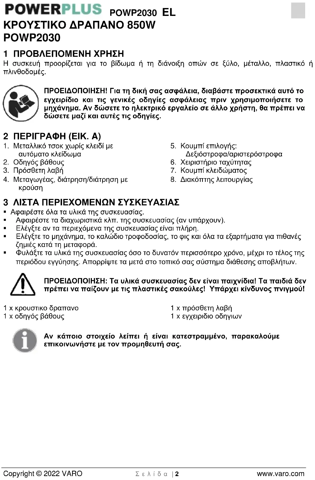 - 13 ΗΛΩΣΗ ΣΥΜΜΟΡΦΩΣΗΣ POWP2030 EL Copyright © 2022 VARO Σ ε λ ί δ α | 2 www.varo.com ΚΡΟΥΣΤΙΚΟ ΔΡΑΠΑΝΟ 850W POWP2030 1 ΠΡΟΒΛΕΠΟΜΕΝΗ ΧΡΗΣΗ Η συσκευή προορίζεται για το βίδωμα ή τη διάνοιξη οπών σε ξύλο, μέταλλο, πλαστικό ή πλινθοδομές. ΠΡΟΕΙΔΟΠΟΙΗΣΗ! Για τη δική σας ασφάλεια, διαβάστε προσεκτικά αυτό το εγχειρίδιο και τις γενικές οδηγίες ασφάλειας πριν χρησιμοποιήσετε το μηχάνημα. Αν δώσετε το ηλεκτρικό εργαλείο σε άλλο χρήστη, θα πρέπει να δώσετε μαζί και αυτές τις οδηγίες. 2 ΠΕΡΙΓΡΑΦΗ (ΕΙΚ. A) p. 9