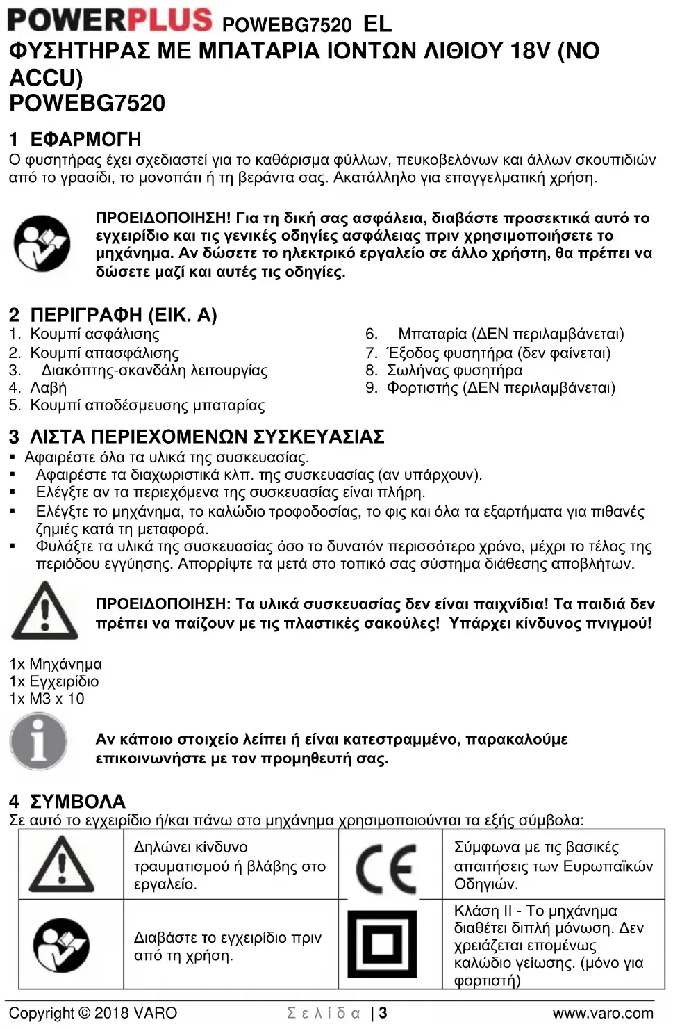 - 17 ΔΗΛΩΣΗ ΣΥΜΜΟΡΦΩΣΗΣ POWEBG7520 EL Copyright © 2018 VARO Σ ε λ ί δ α | 3 www.varo.com ΦΥΣΗΤΗΡΑΣ ΜΕ ΜΠΑΤΑΡΙΑ ΙΟΝΤΩΝ ΛΙΘΙΟΥ 18V (NO ACCU) POWEBG7520 1 ΕΦΑΡΜΟΓΗ Ο φυσητήρας έχει σχεδιαστεί για το καθάρισμα φύλλων, πευκοβελόνων και άλλων σκουπιδιών από το γρασίδι, το μονοπάτι ή τη βεράντα σας. Ακατάλληλο για επαγγελματική χρήση. ΠΡΟΕΙΔΟΠΟΙΗΣΗ! Για τη δική σας ασφάλεια, διαβάστε προσεκτικά αυτό το εγχειρίδιο και τις γενικές οδηγίες ασφάλειας πριν χρησιμοποιήσετε το μηχάνημα. Αν δώσετε το ηλεκτρικό εργαλείο σε άλλο χρήστη, θα πρέπει να δώσετε μαζί και αυτές τις οδηγίες. 2 ΠΕΡΙΓΡΑΦΗ (ΕΙΚ. A) p. 11