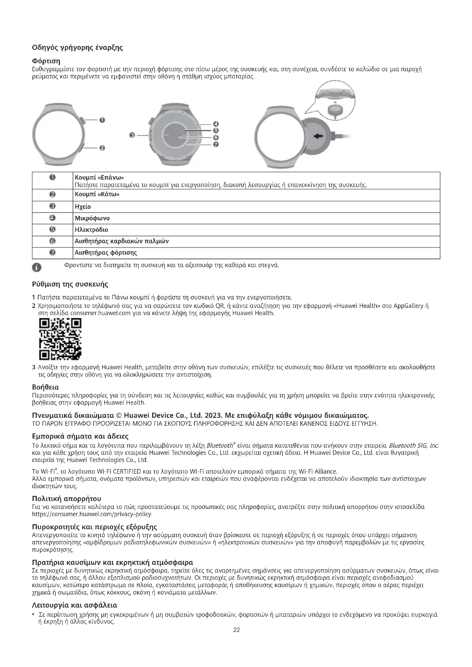 Περισσότερες πληροφορίες για τη σύνδεση και τις λειτουργίες καθώς και συμβουλές για τη χρήση μπορείτε να βρείτε στην ενότητα ηλεκτρονικής βοήθειας στην εφαρμογή Huawei Health. Πνευματικά δικαιώματα © Huawei Device Co., Ltd. 2023. Με επιφύλαξη κάθε νόμιμου δικαιώματος. ΤΟ ΠΑΡΟΝ ΕΓΓΡΑΦΟ ΠΡΟΟΡΙΖΕΤΑΙ ΜΟΝΟ ΓΙΑ ΣΚΟΠΟΥΣ ΠΛΗΡΟΦΟΡΗΣΗΣ ΚΑΙ ΔΕΝ ΑΠΟΤΕΛΕΙ ΚΑΝΕΝΟΣ ΕΙΔΟΥΣ ΕΓΓΥΗΣΗ. Εμπορικά σήματα και άδειες Το λεκτικό σήμα και τα λογότυπα που περιλαμβάνουν τη λέξη Bluetooth
