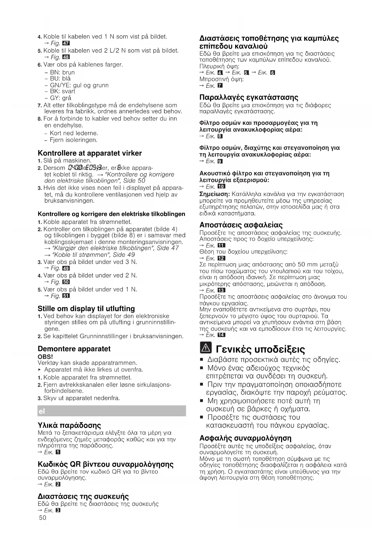 Γενικές υποδείξεις ¡ Διαβάστε προσεκτικά αυτές τις οδηγίες. ¡ Μόνο ένας αδειούχος τεχνικός επιτρέπεται να συνδέσει τη συσκευή. ¡ Πριν την πραγματοποίηση οποιασδήποτε εργασίας, διακόψτε την παροχή ρεύματος. ¡ Μη χρησιμοποιήσετε ποτέ αυτή τη συσκευή σε βάρκες ή οχήματα. ¡ Προσέξτε τις συστάσεις του κατασκευαστή του πάγκου εργασίας. Ασφαλής συναρμολόγηση Προσέξτε αυτές τις υποδείξεις ασφαλείας, όταν συναρμολογείτε τη συσκευή. Μόνο με τη σωστή τοποθέτηση σύμφωνα με τις οδηγίες τοποθέτησης διασφαλίζεται η ασφάλεια κατά τη χρήση. Ο εγκαταστάτης είναι υπεύθυνος για την άψογη λειτουργία στη θέση τοποθέτησης.51 ΠΡΟΕΙΔΟΠΟΙΗΣΗ‒Κίνδυνος: Μαγνητισμός! Η συσκευή περιέχει μόνιμους μαγνήτες. Αυτοί μπορούν να επηρεάσουν αρνητικά τα ηλεκτρονικά στοιχεία εμφύτευσης, π.χ. βηματοδότες καρδιάς ή αντλίες ινσουλίνης. ▶ Οι φορείς ηλεκτρονικών στοιχείων εμφύτευσης πρέπει να τηρούν μια ελάχιστη απόσταση 10 cm από τη συσκευή. ΠΡΟΕΙΔΟΠΟΙΗΣΗ‒Κίνδυνος δηλητηρίασης! Τα επαναρροφούμενα αέρια καύσης μπορούν να προκαλέσουν δηλητηριάσεις. Εστίες, εξαρτημένες από τον αέρα του περιβάλλοντος (π.χ. συσκευές θέρμανσης που λειτουργούν με αέριο, πετρέλαιο, ξύλο ή άνθρακα, ταχυθερμοσίφωνες, θερμαντήρες νερού) λαμβάνουν τον αέρα για καύση από τον χώρο τοποθέτησης και οδηγούν τα καυσαέρια μέσα από μια εγκατάσταση απαγωγής των καυσαερίων (π.χ. καμινάδα) στον έξω χώρο. Σε συνδυασμό με έναν ενεργοποιημένο απορροφητήρα αφαιρείται αέρας από την κουζίνα και τους γειτονικούς χώρους. Χωρίς επαρκή παροχή αέρα δημιουργείται μια υποπίεση. Τα δηλητηριώδη αέρια από την καμινάδα ή τον απορροφητήρα επιστρέφουν πίσω στα δωμάτια του