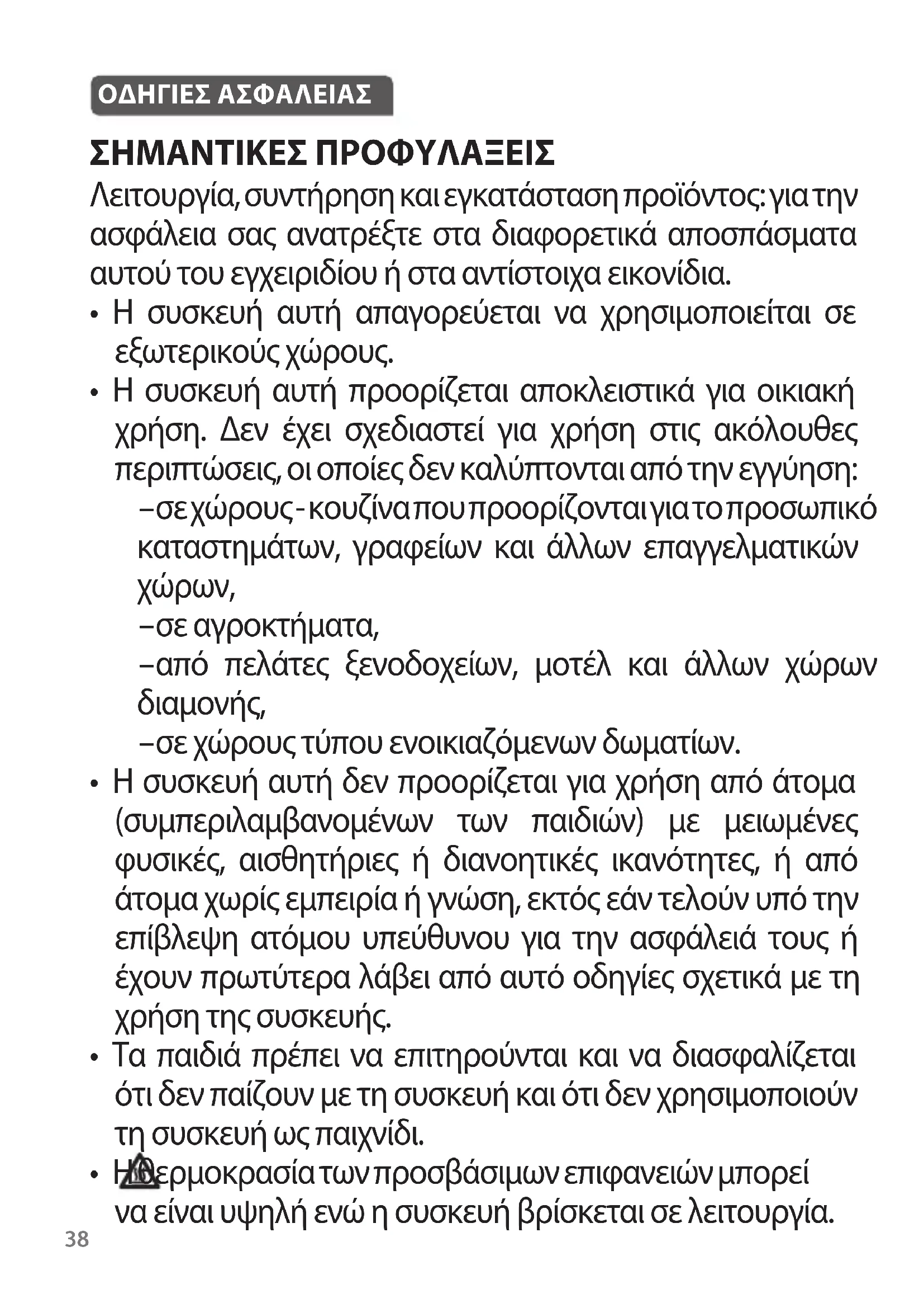 - Η συσκευή αυτή δεν προορίζεται για χρήση από άτομα (συμπεριλαμβανομένων των παιδιών) με μειωμένες φυσικές, αισθητήριες ή διανοητικές ικανότητες, ή από άτομα χωρίς εμπειρία ή γνώση, εκτός εάν τελούν υπό την επίβλεψη ατόμου υπεύθυνου για την ασφάλειά τους ή έχουν πρωτύτερα λάβει από αυτό οδηγίες σχετικά με τη χρήση της συσκευής.