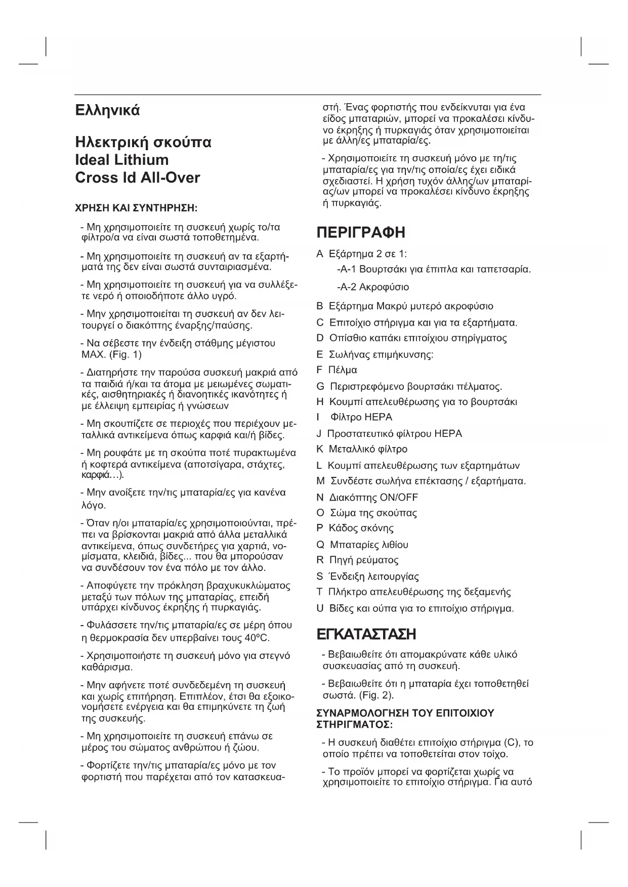 CAŁKOWITYM ZUŻYCIU URZĄDZENIA, NALEŻY: - Pociągnąć akumulator do góry, aby wyciągnąć go z obudowy. (Rys. 11).Ελληνικά Ηλεκτρική σκούπα Ideal Lithium Cross Id All-Over ΧΡΗΣΗ ΚΑΙ ΣΥΝΤΗΡΗΣΗ: - Μη χρησιμοποιείτε τη συσκευή χωρίς το/τα φίλτρο/α να είναι σωστά τοποθετημένα. - Μη χρησιμοποιείτε τη συσκευή αν τα εξαρτή- ματά της δεν είναι σωστά συνταιριασμένα. - Μη χρησιμοποιείτε τη συσκευή για να συλλέξε- τε νερό ή οποιοδήποτε άλλο υγρό. - Μην χρησιμοποιείται τη συσκευή αν δεν λει- τουργεί ο διακόπτης έναρξης/παύσης. - Να σέβεστε την ένδειξη στάθμης μέγιστου MAX. (Fig. 1) - Διατηρήστε την παρούσα συσκευή μακριά από τα παιδιά ή/και τα άτομα με μειωμένες σωματι- κές, αισθητηριακές ή διανοητικές ικανότητες ή με έλλειψη εμπειρίας ή γνώσεων - Μη σκουπίζετε σε περιοχές που περιέχουν με- ταλλικά αντικείμενα όπως καρφιά και/ή βίδες. - Μη ρουφάτε με τη σκούπα ποτέ πυρακτωμένα ή κοφτερά αντικείμενα (αποτσίγαρα, στάχτες,