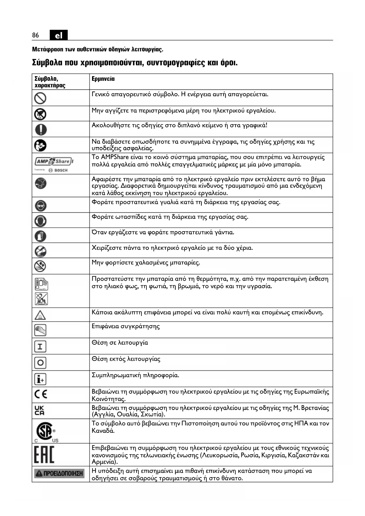 Μετάφραση των αυθεντικών οδηγιών λειτουργίας. Σύμβολα που χρησιμοποιούνται, συντομογραφίες και όροι.