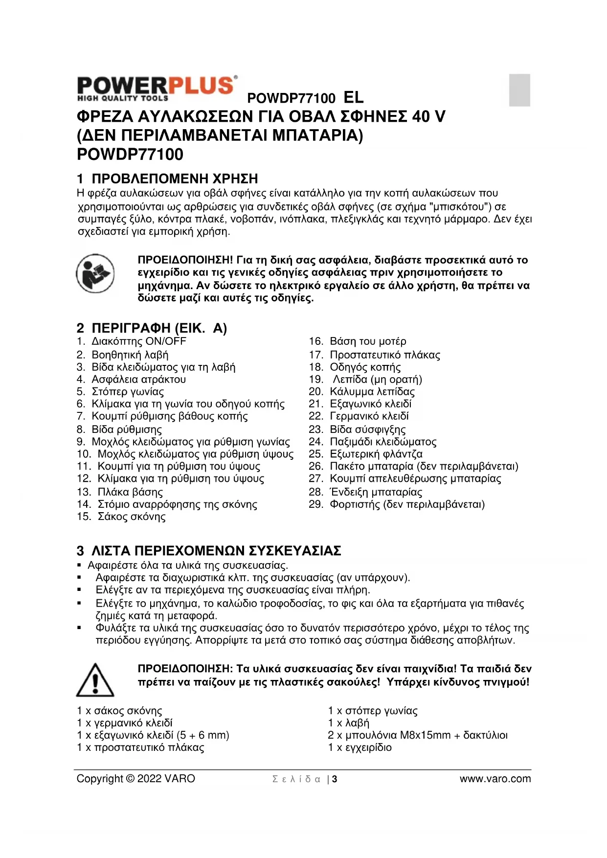 - 18 ΔΗΛΩΣΗ ΣΥΜΜΟΡΦΩΣΗΣ POWDP77100 EL Copyright © 2022 VARO Σ ε λ ί δ α | 3 www.varo.com ΦΡΕΖΑ ΑΥΛΑΚΩΣΕΩΝ ΓΙΑ ΟΒΑΛ ΣΦΗΝΕΣ 40 V (ΔΕΝ ΠΕΡΙΛΑΜΒΑΝΕΤΑΙ ΜΠΑΤΑΡΙΑ) POWDP77100 1 ΠΡΟΒΛΕΠΟΜΕΝΗ ΧΡΗΣΗ Η φρέζα αυλακώσεων για οβάλ σφήνες είναι κατάλληλο για την κοπή αυλακώσεων που χρησιμοποιούνται ως αρθρώσεις για συνδετικές οβάλ σφήνες (σε σχήμα "μπισκότου") σε συμπαγές ξύλο, κόντρα πλακέ, νοβοπάν, ινόπλακα, πλεξιγκλάς και τεχνητό μάρμαρο. Δεν έχει σχεδιαστεί για εμπορική χρήση. ΠΡΟΕΙΔΟΠΟΙΗΣΗ! Για τη δική σας ασφάλεια, διαβάστε προσεκτικά αυτό το εγχειρίδιο και τις γενικές οδηγίες ασφάλειας πριν χρησιμοποιήσετε το μηχάνημα. Αν δώσετε το ηλεκτρικό εργαλείο σε άλλο χρήστη, θα πρέπει να δώσετε μαζί και αυτές τις οδηγίες. 2 ΠΕΡΙΓΡΑΦΗ (ΕΙΚ. A) p. 14