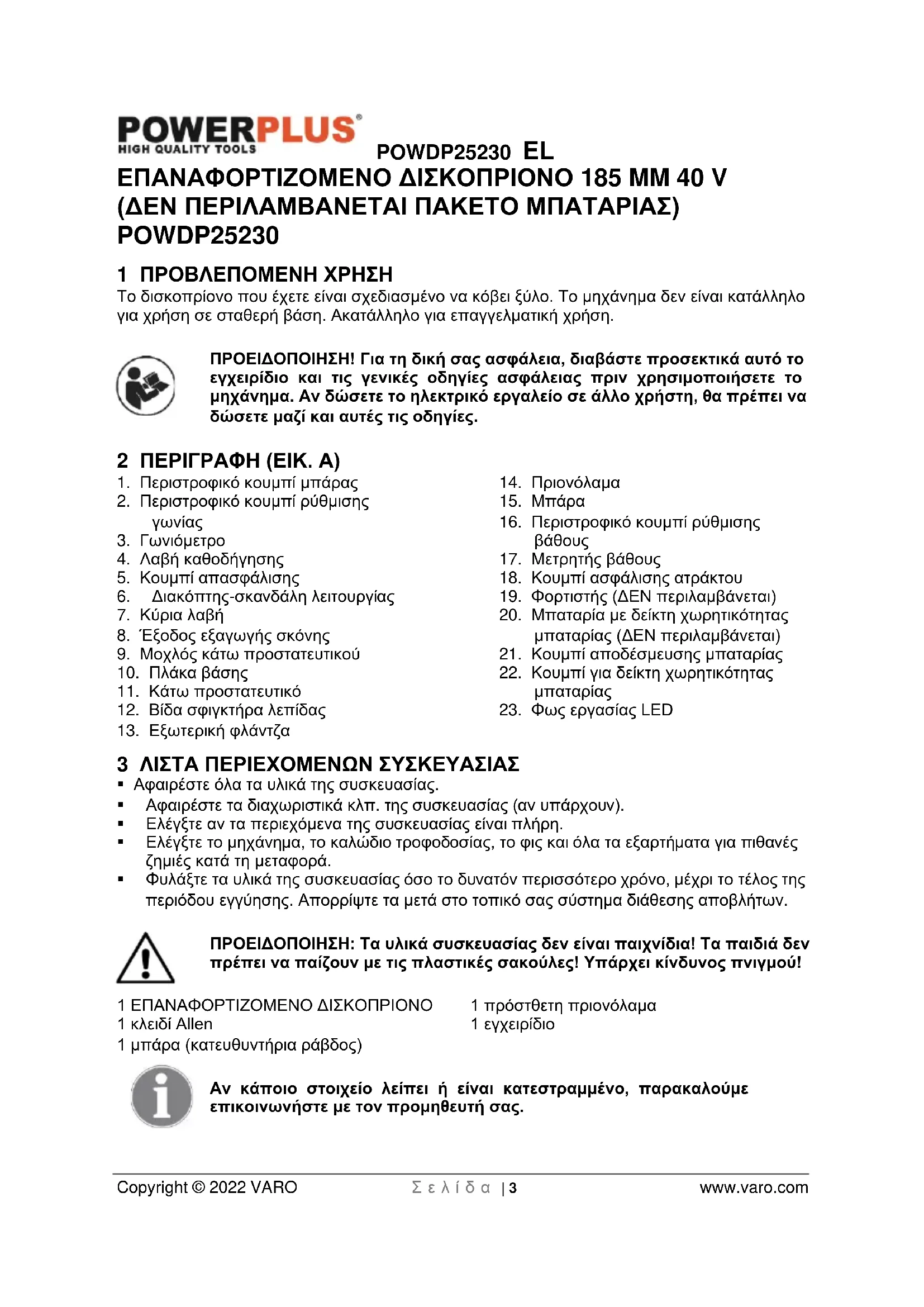 - 18 ΔΗΛΩΣΗ ΣΥΜΜΟΡΦΩΣΗΣ POWDP25230 EL Copyright © 2022 VARO Σ ε λ ί δ α | 3 www.varo.com ΕΠΑΝΑΦΟΡΤΙΖΟΜΕΝΟ ΔΙΣΚΟΠΡΙΟΝΟ 185 MM 40 V (ΔΕΝ ΠΕΡΙΛΑΜΒΑΝΕΤΑΙ ΠΑΚΕΤΟ ΜΠΑΤΑΡΙΑΣ) POWDP25230 1 ΠΡΟΒΛΕΠΟΜΕΝΗ ΧΡΗΣΗ Το δισκοπρίονο που έχετε είναι σχεδιασμένο να κόβει ξύλο. Το μηχάνημα δεν είναι κατάλληλο για χρήση σε σταθερή βάση. Ακατάλληλο για επαγγελματική χρήση. ΠΡΟΕΙΔΟΠΟΙΗΣΗ! Για τη δική σας ασφάλεια, διαβάστε προσεκτικά αυτό το εγχειρίδιο και τις γενικές οδηγίες ασφάλειας πριν χρησιμοποιήσετε το μηχάνημα. Αν δώσετε το ηλεκτρικό εργαλείο σε άλλο χρήστη, θα πρέπει να δώσετε μαζί και αυτές τις οδηγίες. 2 ΠΕΡΙΓΡΑΦΗ (ΕΙΚ. A) p. 15