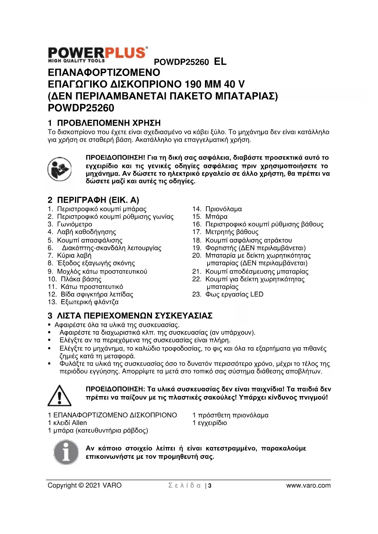 - 18 ΔΗΛΩΣΗ ΣΥΜΜΟΡΦΩΣΗΣ POWDP25260 EL Copyright © 2021 VARO Σ ε λ ί δ α | 3 www.varo.com ΕΠΑΝΑΦΟΡΤΙΖΟΜΕΝΟ ΕΠΑΓΩΓΙΚΟ ΔΙΣΚΟΠΡΙΟΝΟ 190 MM 40 V (ΔΕΝ ΠΕΡΙΛΑΜΒΑΝΕΤΑΙ ΠΑΚΕΤΟ ΜΠΑΤΑΡΙΑΣ) POWDP25260 1 ΠΡΟΒΛΕΠΟΜΕΝΗ ΧΡΗΣΗ Το δισκοπρίονο που έχετε είναι σχεδιασμένο να κόβει ξύλο. Το μηχάνημα δεν είναι κατάλληλο για χρήση σε σταθερή βάση. Ακατάλληλο για επαγγελματική χρήση. ΠΡΟΕΙΔΟΠΟΙΗΣΗ! Για τη δική σας ασφάλεια, διαβάστε προσεκτικά αυτό το εγχειρίδιο και τις γενικές οδηγίες ασφάλειας πριν χρησιμοποιήσετε το μηχάνημα. Αν δώσετε το ηλεκτρικό εργαλείο σε άλλο χρήστη, θα πρέπει να δώσετε μαζί και αυτές τις οδηγίες. 2 ΠΕΡΙΓΡΑΦΗ (ΕΙΚ. A) p. 15
