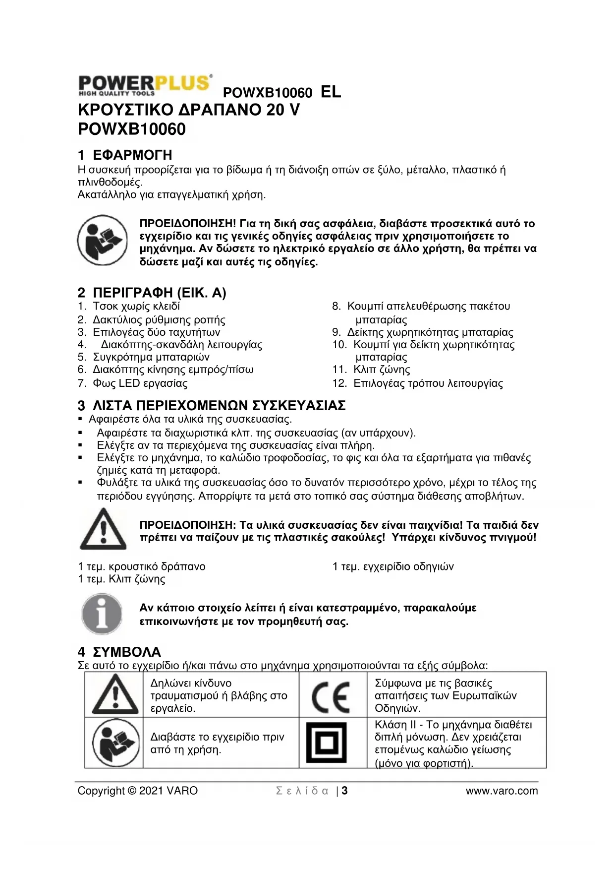 - 16 ΔΗΛΩΣΗ ΣΥΜΜΟΡΦΩΣΗΣ POWXB10060 EL Copyright © 2021 VARO Σ ε λ ί δ α | 3 www.varo.com ΚΡΟΥΣΤΙΚΟ ΔΡΑΠΑΝΟ 20 V POWXB10060 1 ΕΦΑΡΜΟΓΗ Η συσκευή προορίζεται για το βίδωμα ή τη διάνοιξη οπών σε ξύλο, μέταλλο, πλαστικό ή πλινθοδομές. Ακατάλληλο για επαγγελματική χρήση. ΠΡΟΕΙΔΟΠΟΙΗΣΗ! Για τη δική σας ασφάλεια, διαβάστε προσεκτικά αυτό το εγχειρίδιο και τις γενικές οδηγίες ασφάλειας πριν χρησιμοποιήσετε το μηχάνημα. Αν δώσετε το ηλεκτρικό εργαλείο σε άλλο χρήστη, θα πρέπει να δώσετε μαζί και αυτές τις οδηγίες. 2 ΠΕΡΙΓΡΑΦΗ (ΕΙΚ. A) p. 16