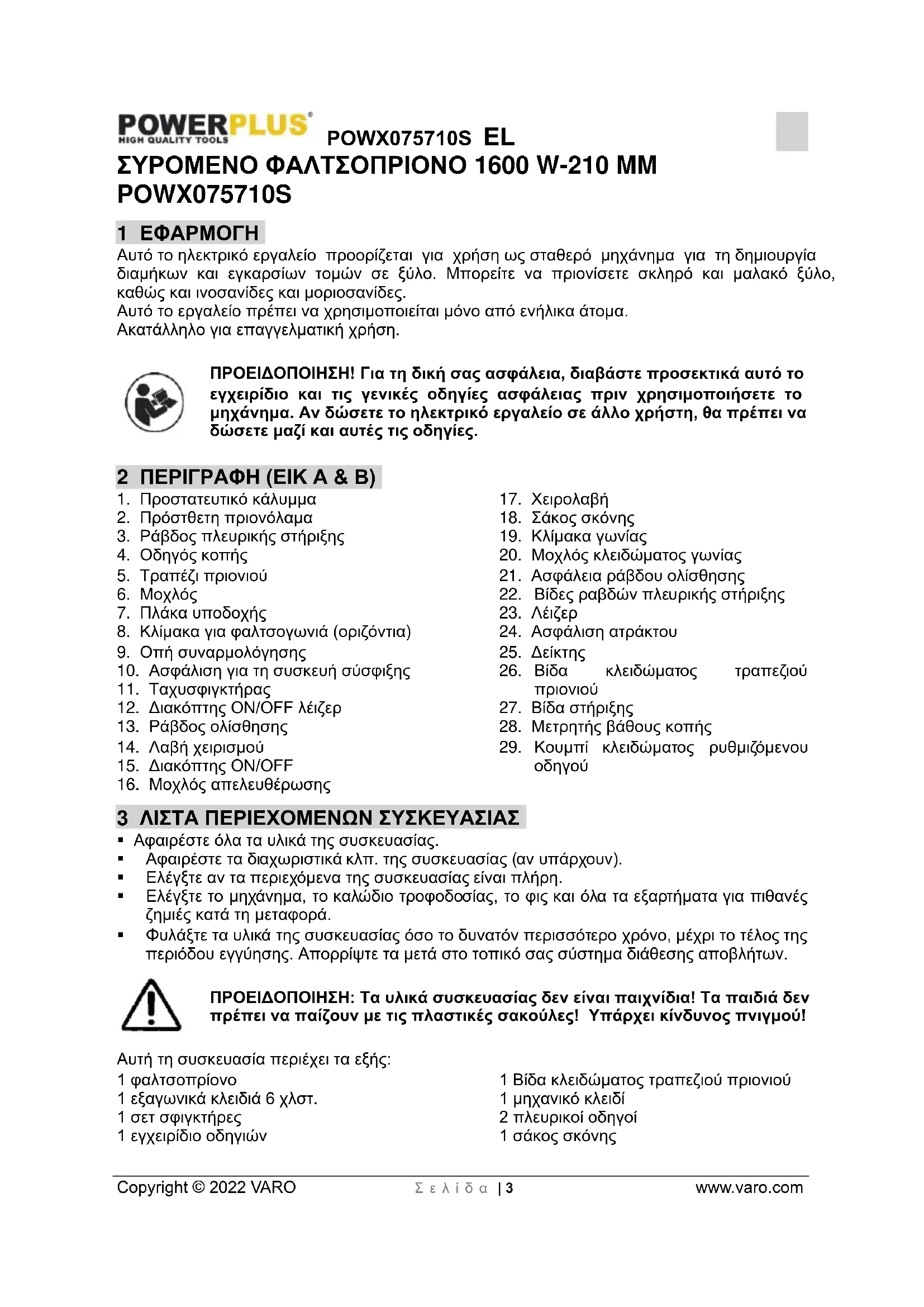 Copyright © 2022 VARO Σ ε λ ί δ α | 3 www.varo.com ΣΥΡΟΜΕΝΟ ΦΑΛΤΣΟΠΡΙΟΝΟ 1600 W-210 MM POWX075710S 1 ΕΦΑΡΜΟΓΗ Αυτό το ηλεκτρικό εργαλείο προορίζεται για χρήση ως σταθερό μηχάνημα για τη δημιουργία διαμήκων και εγκαρσίων τομών σε ξύλο. Μπορείτε να πριονίσετε σκληρό και μαλακό ξύλο, καθώς και ινοσανίδες και μοριοσανίδες. Αυτό το εργαλείο πρέπει να χρησιμοποιείται μόνο από ενήλικα άτομα. Ακατάλληλο για επαγγελματική χρήση. ΠΡΟΕΙΔΟΠΟΙΗΣΗ! Για τη δική σας ασφάλεια, διαβάστε προσεκτικά αυτό το εγχειρίδιο και τις γενικές οδηγίες ασφάλειας πριν χρησιμοποιήσετε το μηχάνημα. Αν δώσετε το ηλεκτρικό εργαλείο σε άλλο χρήστη, θα πρέπει να δώσετε μαζί και αυτές τις οδηγίες. 2 ΠΕΡΙΓΡΑΦΗ (ΕΙΚ A & B)