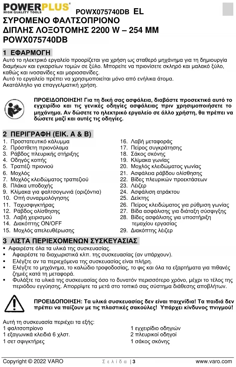 Copyright © 2022 VARO Σ ε λ ί δ α | 3 www.varo.com ΣΥΡΟΜΕΝΟ ΦΑΛΤΣΟΠΡΙΟΝΟ ΔΙΠΛΗΣ ΛΟΞΟΤΟΜΗΣ 2200 W – 254 MM POWX075740DB 1 ΕΦΑΡΜΟΓΗ Αυτό το ηλεκτρικό εργαλείο προορίζεται για χρήση ως σταθερό μηχάνημα για τη δημιουργία διαμήκων και εγκαρσίων τομών σε ξύλο. Μπορείτε να πριονίσετε σκληρό και μαλακό ξύλο, καθώς και ινοσανίδες και μοριοσανίδες. Αυτό το εργαλείο πρέπει να χρησιμοποιείται μόνο από ενήλικα άτομα. Ακατάλληλο για επαγγελματική χρήση. ΠΡΟΕΙΔΟΠΟΙΗΣΗ! Για τη δική σας ασφάλεια, διαβάστε προσεκτικά αυτό το εγχειρίδιο και τις γενικές οδηγίες ασφάλειας πριν χρησιμοποιήσετε το μηχάνημα. Αν δώσετε το ηλεκτρικό εργαλείο σε άλλο χρήστη, θα πρέπει να δώσετε μαζί και αυτές τις οδηγίες. 2 ΠΕΡΙΓΡΑΦΗ (ΕΙΚ. A & B)