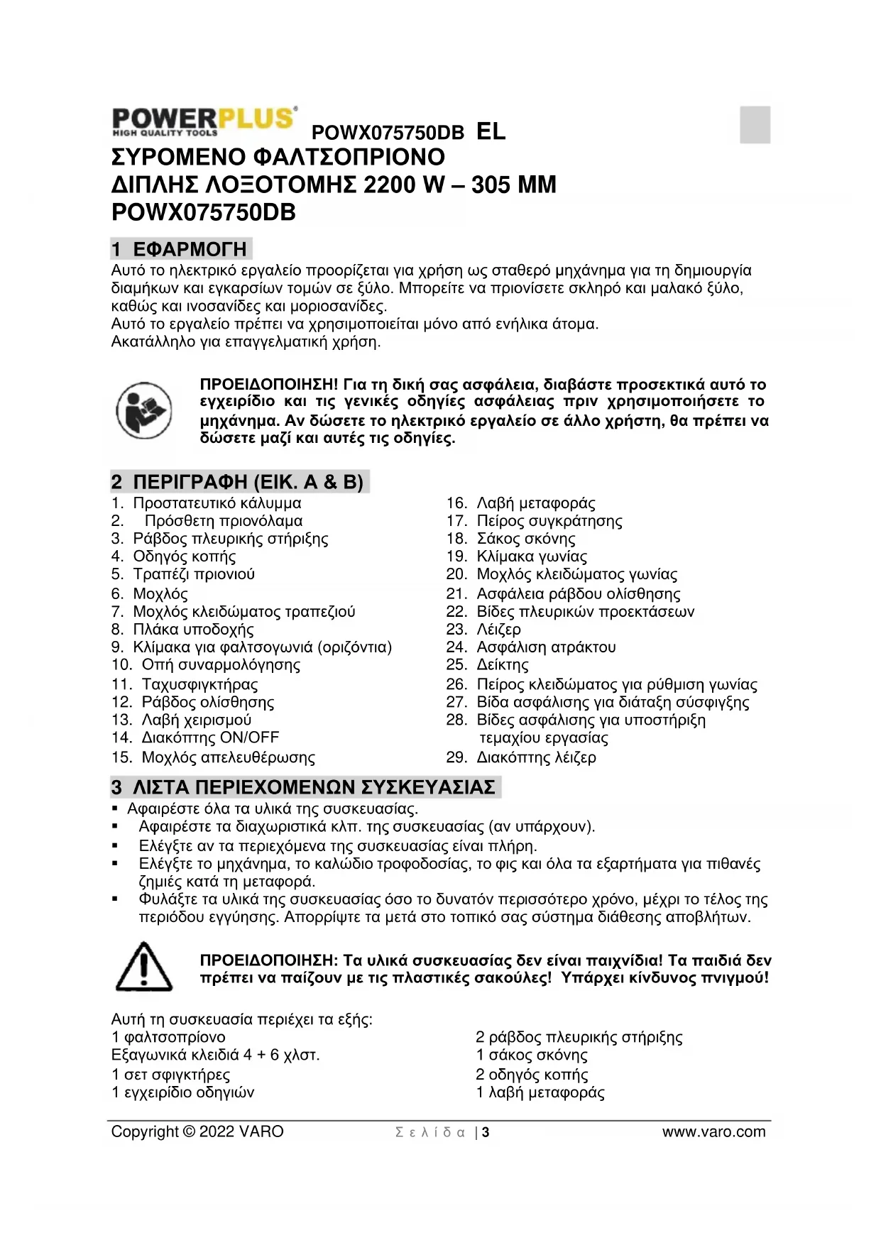 Copyright © 2022 VARO Σ ε λ ί δ α | 3 www.varo.com ΣΥΡΟΜΕΝΟ ΦΑΛΤΣΟΠΡΙΟΝΟ ΔΙΠΛΗΣ ΛΟΞΟΤΟΜΗΣ 2200 W – 305 MM POWX075750DB 1 ΕΦΑΡΜΟΓΗ Αυτό το ηλεκτρικό εργαλείο προορίζεται για χρήση ως σταθερό μηχάνημα για τη δημιουργία διαμήκων και εγκαρσίων τομών σε ξύλο. Μπορείτε να πριονίσετε σκληρό και μαλακό ξύλο, καθώς και ινοσανίδες και μοριοσανίδες. Αυτό το εργαλείο πρέπει να χρησιμοποιείται μόνο από ενήλικα άτομα. Ακατάλληλο για επαγγελματική χρήση. ΠΡΟΕΙΔΟΠΟΙΗΣΗ! Για τη δική σας ασφάλεια, διαβάστε προσεκτικά αυτό το εγχειρίδιο και τις γενικές οδηγίες ασφάλειας πριν χρησιμοποιήσετε το μηχάνημα. Αν δώσετε το ηλεκτρικό εργαλείο σε άλλο χρήστη, θα πρέπει να δώσετε μαζί και αυτές τις οδηγίες. 2 ΠΕΡΙΓΡΑΦΗ (ΕΙΚ. A & B)