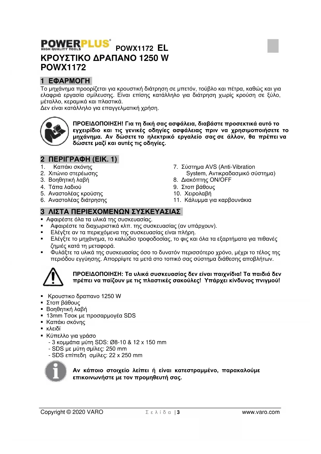 13mm Τσοκ με προσαρμογέα SDSPOWX1172 EL Copyright © 2020 VARO Σ ε λ ί δ α | 10 www.varo.com 12 ΘΟΡΥΒΟΣ Τιμές εκπομπής θορύβου μετρημένες σύμφωνα με το σχετικό πρότυπο. (K=3) Στάθμη ηχητικής πίεσης LpA 92 dB(A) Στάθμη ηχητικής ισχύος LwA 103 dB(A) ΠΡΟΣΟΧΗ! Φοράτε ωτοασπίδες όταν η ηχητική πίεση είναι πάνω από 85 dB(A). aw (Κραδασμοί): 14,6 m/s² K = 1,5 m/s² 13 ΤΜΗΜΑ ΕΞΥΠΗΡΕΤΗΣΗΣ Οι χαλασμένοι διακόπτες πρέπει να αντικαθίστανται από άτομο του τμήματος εξυπηρέτησης πελατών μας. Αν το καλώδιο τροφοδοσίας (ή το φις) χαλάσει, πρέπει να αντικατασταθεί με ειδικό καλώδιο τροφοδοσίας που διατίθεται στο τμήμα εξυπηρέτησης πελατών μας. Η αντικατάσταση του καλωδίου τροφοδοσίας πρέπει να γίνεται μόνο από άτομο του τμήματος εξυπηρέτησης πελατών μας (δείτε τελευταία σελίδα) ή από εξειδικευμένο άτομο (εξειδικευμένο ηλεκτρολόγο). 14 ΑΠΟΘΗΚΕΥΣΗ Καθαρίστε επιμελημένα ολόκληρο το μηχάνημα και τα εξαρτήματά του. Αποθηκεύστε το σε μέρος όπου δεν πλησιάζουν παιδιά, σε μια σταθερή και ασφαλή θέση, σε δροσερό και ξηρό χώρο, αποφεύγοντας τις πολύ υψηλές ή πολύ χαμηλές θερμοκρασίες. Προστατεύετέ το από την έκθεση στον ήλιο. Να βρίσκεται στο σκοτάδι, αν είναι δυνατόν. Μην το φυλάγετε μέσα σε πλαστικές σακούλες για να αποφύγετε τη συσσώρευση υγρασίας.POWX1172 EL Copyright © 2020 VARO Σ ε λ ί δ α | 11 www.varo.com 15 ΕΓΓΥΗΣΗ Αυτό το προϊόν έχει εγγύηση για περίοδο 36 μηνών που ισχύει από την ημερομηνία αγοράς του πρώτου χρήστη. Αυτή η εγγύηση καλύπτει όλα τα ελαττώματα υλικών και κατασκευής. Δεν συμπεριλαμβάνει μπαταρίες, φορτιστές, ελαττωματικά εξαρτήματα που υπόκεινται σε φυσιολογική φθορά, όπως ρουλεμάν, καρβουνάκια, καλώδια και φις, ή αξεσουάρ όπως τρυπάνια, μύτες τρυπανιών, πριονόλαμες, κλπ., ζημιές ή ελαττώματα που προκύπτουν από κακή χρήση, ατυχήματα ή τροποποιήσεις, ούτε έξοδα μεταφοράς. Ζημιές ή/και ελαττώματα που προκύπτουν από κακή χρήση, επίσης δεν εμπίπτουν στους όρους αυτής της εγγύησης. Επίσης αποποιούμεθα κάθε ευθύνη για οποιονδήποτε σωματικό τραυματισμό προκληθεί από κακή χρήση του εργαλείου. Οι επισκευές πρέπει να γίνονται μόνο από εξουσιοδοτημένο κέντρο εξυπηρέτησης πελατών για εργαλεία Powerplus. Για περισσότερες πληροφορίες, μπορείτε πάντα να καλέσετε τον αριθμό 00 32 3 292 92
