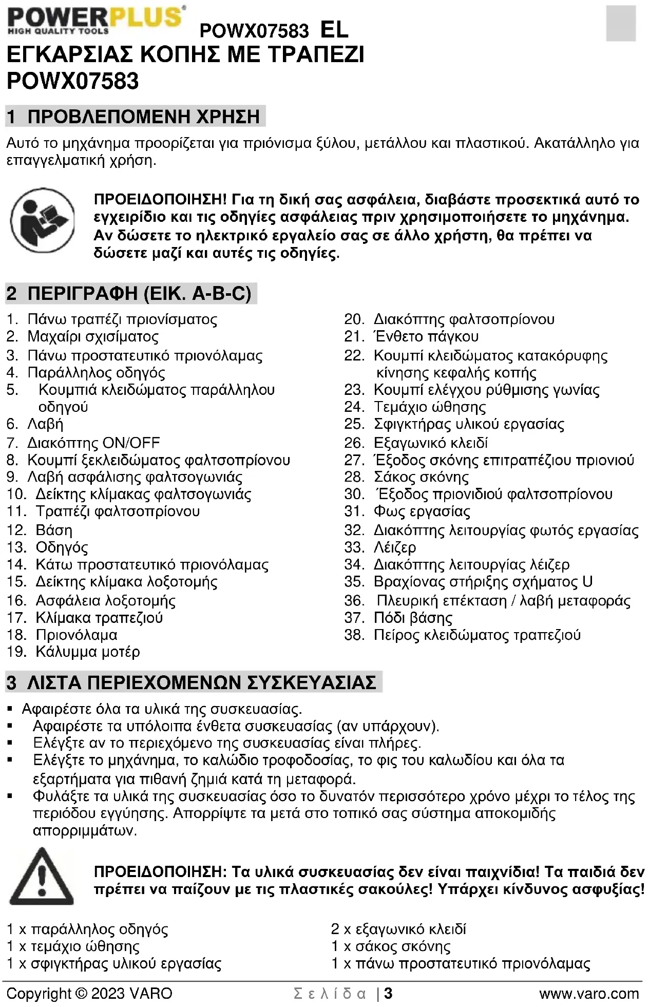 - 18 ΔΗΛΩΣΗ ΣΥΜΜΟΡΦΩΣΗΣ POWX07583 EL Copyright © 2023 VARO Σ ε λ ί δ α | 3 www.varo.com ΕΓΚΑΡΣΙΑΣ ΚΟΠΗΣ ΜΕ ΤΡΑΠΕΖΙ POWX07583 1 ΠΡΟΒΛΕΠΟΜΕΝΗ ΧΡΗΣΗ Αυτό το μηχάνημα προορίζεται για πριόνισμα ξύλου, μετάλλου και πλαστικού. Ακατάλληλο για επαγγελματική χρήση. ΠΡΟΕΙΔΟΠΟΙΗΣΗ! Για τη δική σας ασφάλεια, διαβάστε προσεκτικά αυτό το εγχειρίδιο και τις οδηγίες ασφάλειας πριν χρησιμοποιήσετε το μηχάνημα. Αν δώσετε το ηλεκτρικό εργαλείο σας σε άλλο χρήστη, θα πρέπει να δώσετε μαζί και αυτές τις οδηγίες. 2 ΠΕΡΙΓΡΑΦΗ (ΕΙΚ. A-B-C) p. 18