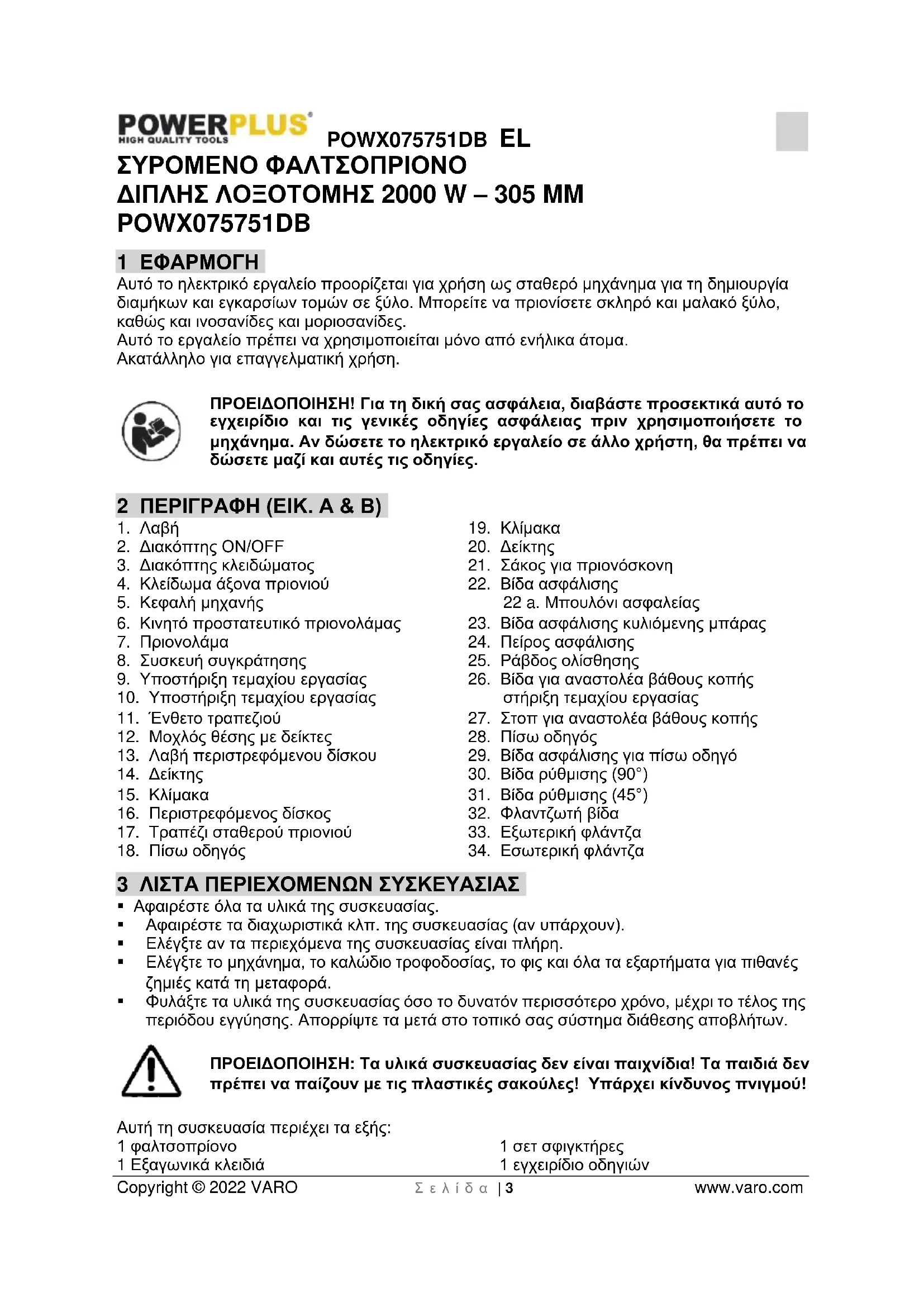 Copyright © 2022 VARO Σ ε λ ί δ α | 3 www.varo.com ΣΥΡΟΜΕΝΟ ΦΑΛΤΣΟΠΡΙΟΝΟ ΔΙΠΛΗΣ ΛΟΞΟΤΟΜΗΣ 2000 W – 305 MM POWX075751DB 1 ΕΦΑΡΜΟΓΗ Αυτό το ηλεκτρικό εργαλείο προορίζεται για χρήση ως σταθερό μηχάνημα για τη δημιουργία διαμήκων και εγκαρσίων τομών σε ξύλο. Μπορείτε να πριονίσετε σκληρό και μαλακό ξύλο, καθώς και ινοσανίδες και μοριοσανίδες. Αυτό το εργαλείο πρέπει να χρησιμοποιείται μόνο από ενήλικα άτομα. Ακατάλληλο για επαγγελματική χρήση. ΠΡΟΕΙΔΟΠΟΙΗΣΗ! Για τη δική σας ασφάλεια, διαβάστε προσεκτικά αυτό το εγχειρίδιο και τις γενικές οδηγίες ασφάλειας πριν χρησιμοποιήσετε το μηχάνημα. Αν δώσετε το ηλεκτρικό εργαλείο σε άλλο χρήστη, θα πρέπει να δώσετε μαζί και αυτές τις οδηγίες. 2 ΠΕΡΙΓΡΑΦΗ (ΕΙΚ. A & B)