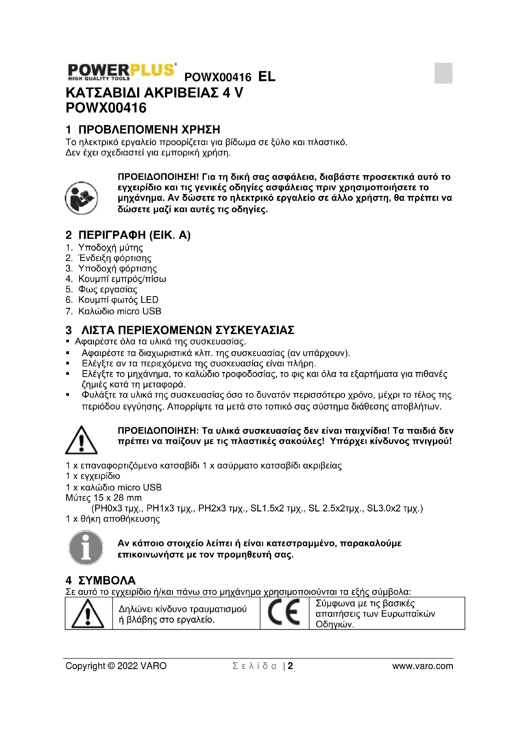 - 13 ΔΗΛΩΣΗ ΣΥΜΜΟΡΦΩΣΗΣ POWX00416 EL Copyright © 2022 VARO Σ ε λ ί δ α | 2 www.varo.com KΑΤΣΑΒΙΔΙ ΑΚΡΙΒΕΙΑΣ 4 V POWX00416 1 ΠΡΟΒΛΕΠΟΜΕΝΗ ΧΡΗΣΗ Το ηλεκτρικό εργαλείο προορίζεται για βίδωμα σε ξύλο και πλαστικό. Δεν έχει σχεδιαστεί για εμπορική χρήση. ΠΡΟΕΙΔΟΠΟΙΗΣΗ! Για τη δική σας ασφάλεια, διαβάστε προσεκτικά αυτό το εγχειρίδιο και τις γενικές οδηγίες ασφάλειας πριν χρησιμοποιήσετε το μηχάνημα. Αν δώσετε το ηλεκτρικό εργαλείο σε άλλο χρήστη, θα πρέπει να δώσετε μαζί και αυτές τις οδηγίες. 2 ΠΕΡΙΓΡΑΦΗ (ΕΙΚ. A) p. 9