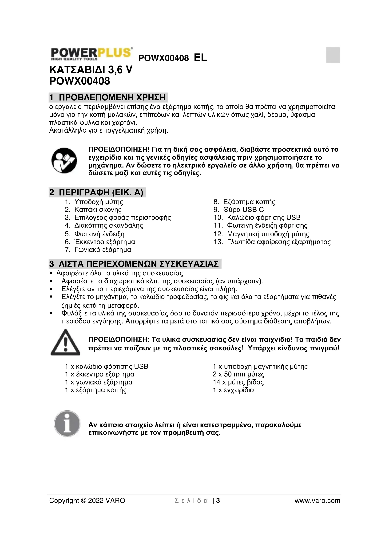 - 13 ΔΗΛΩΣΗ ΣΥΜΜΟΡΦΩΣΗΣ POWX00408 EL Copyright © 2022 VARO Σ ε λ ί δ α | 3 www.varo.com ΚΑΤΣΑΒΙΔΙ 3,6 V POWX00408 1 ΠΡΟΒΛΕΠΟΜΕΝΗ ΧΡΗΣΗ ο εργαλείο περιλαμβάνει επίσης ένα εξάρτημα κοπής, το οποίο θα πρέπει να χρησιμοποιείται μόνο για την κοπή μαλακών, επίπεδων και λεπτών υλικών όπως χαλί, δέρμα, ύφασμα, πλαστικά φύλλα και χαρτόνι. Ακατάλληλο για επαγγελματική χρήση. ΠΡΟΕΙΔΟΠΟΙΗΣΗ! Για τη δική σας ασφάλεια, διαβάστε προσεκτικά αυτό το εγχειρίδιο και τις γενικές οδηγίες ασφάλειας πριν χρησιμοποιήσετε το μηχάνημα. Αν δώσετε το ηλεκτρικό εργαλείο σε άλλο χρήστη, θα πρέπει να δώσετε μαζί και αυτές τις οδηγίες. 2 ΠΕΡΙΓΡΑΦΗ (ΕΙΚ. A) p. 11