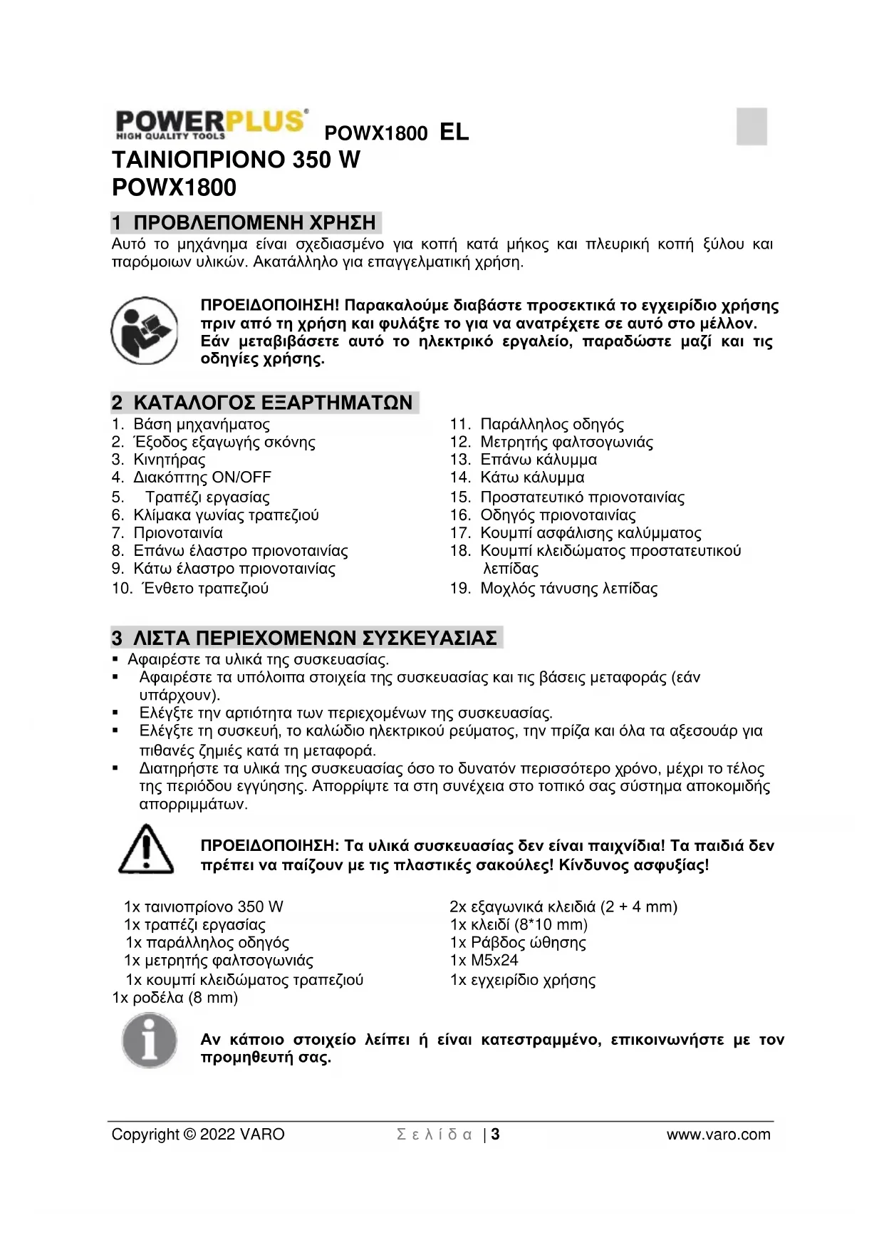 - 18 ΔΗΛΩΣΗ ΣΥΜΜΟΡΦΩΣΗΣ POWX1800 EL Copyright © 2022 VARO Σ ε λ ί δ α | 3 www.varo.com ΤΑΙΝΙΟΠΡΙΟΝΟ 350 W POWX1800 1 ΠΡΟΒΛΕΠΟΜΕΝΗ ΧΡΗΣΗ Αυτό το μηχάνημα είναι σχεδιασμένο για κοπή κατά μήκος και πλευρική κοπή ξύλου και παρόμοιων υλικών. Ακατάλληλο για επαγγελματική χρήση. ΠΡΟΕΙΔΟΠΟΙΗΣΗ! Παρακαλούμε διαβάστε προσεκτικά το εγχειρίδιο χρήσης πριν από τη χρήση και φυλάξτε το για να ανατρέχετε σε αυτό στο μέλλον. Εάν μεταβιβάσετε αυτό το ηλεκτρικό εργαλείο, παραδώστε μαζί και τις οδηγίες χρήσης. 2 ΚΑΤΑΛΟΓΟΣ ΕΞΑΡΤΗΜΑΤΩΝ p. 15