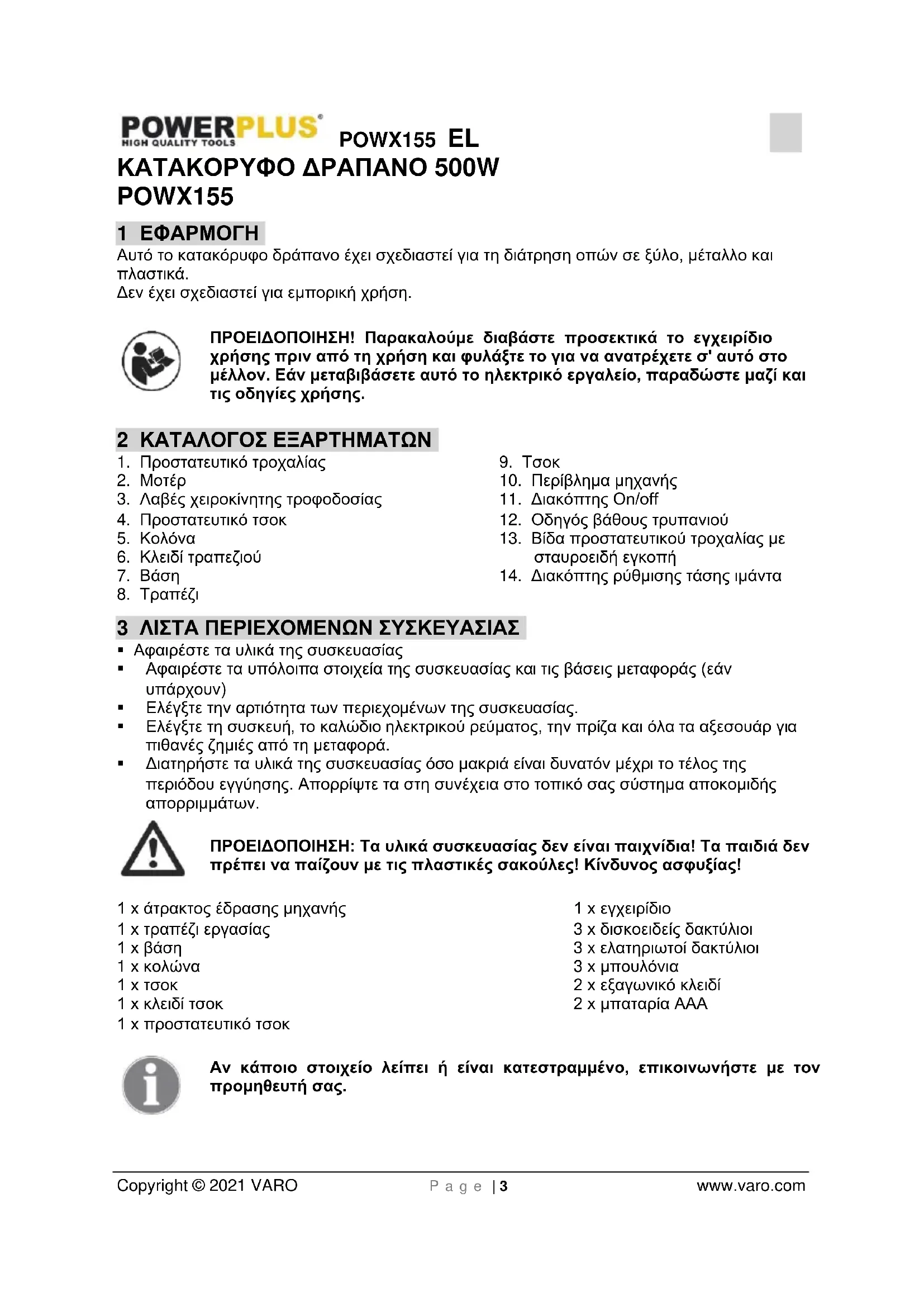- Το μηχάνημά σας πρέπει να επιστραφεί στον προμηθευτή σας μη αποσυναρμολογημένο και σε αποδεκτά καθαρή κατάσταση, (μέσα στην αρχική του πλαστική συσκευασία, αν ισχύει για το προϊόν), συνοδευόμενο από την απόδειξη αγοράς. 17 ΠΕΡΙΒΑΛΛΟΝ Εάν η συσκευή σας πρέπει να αντικατασταθεί μετά από παρατεταμένη χρήση, μην την πετάξετε στα οικιακά απορρίμματα αλλά απορρίψτε την με ασφαλή για το περιβάλλον τρόπο. Τα απορρίμματα που παράγονται από τα ηλεκτρικά μηχανήματα δεν μπορούμε να τα επεξεργαστούμε όπως τα οικιακά απορρίμματα. Προνοήστε για την ανακύκλωση εκεί όπου είναι διαθέσιμες οι κατάλληλες εγκαταστάσεις. Συμβουλευθείτε τους τοπικούς φορείς ή τον αντιπρόσωπο για συμβουλές σχετικά με τη συλλογή και την απόρριψη.POWX155 HR Copyright © 2021 VARO S t r a n i c a | 1 www.varo.com 1 PRIMJENA ....................................................................................... 3 2 OPIS ................................................................................................. 3
