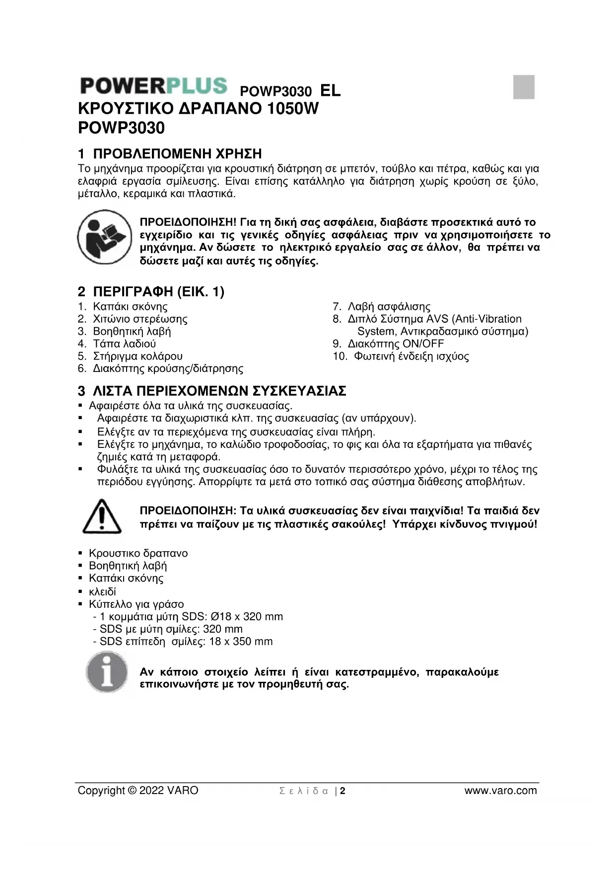 - 16 ΔΗΛΩΣΗ ΣΥΜΜΟΡΦΩΣΗΣ POWP3030 EL Copyright © 2022 VARO Σ ε λ ί δ α | 2 www.varo.com ΚΡΟΥΣΤΙΚΟ ΔΡΑΠΑΝΟ 1050W POWP3030 1 ΠΡΟΒΛΕΠΟΜΕΝΗ ΧΡΗΣΗ Το μηχάνημα προορίζεται για κρουστική διάτρηση σε μπετόν, τούβλο και πέτρα, καθώς και για ελαφριά εργασία σμίλευσης. Είναι επίσης κατάλληλο για διάτρηση χωρίς κρούση σε ξύλο, μέταλλο, κεραμικά και πλαστικά. ΠΡΟΕΙΔΟΠΟΙΗΣΗ! Για τη δική σας ασφάλεια, διαβάστε προσεκτικά αυτό το εγχειρίδιο και τις γενικές οδηγίες ασφάλειας πριν να χρησιμοποιήσετε το μηχάνημα. Αν δώσετε το ηλεκτρικό εργαλείο σας σε άλλον, θα πρέπει να δώσετε μαζί και αυτές τις οδηγίες. 2 ΠΕΡΙΓΡΑΦΗ (ΕΙΚ. 1) p. 10