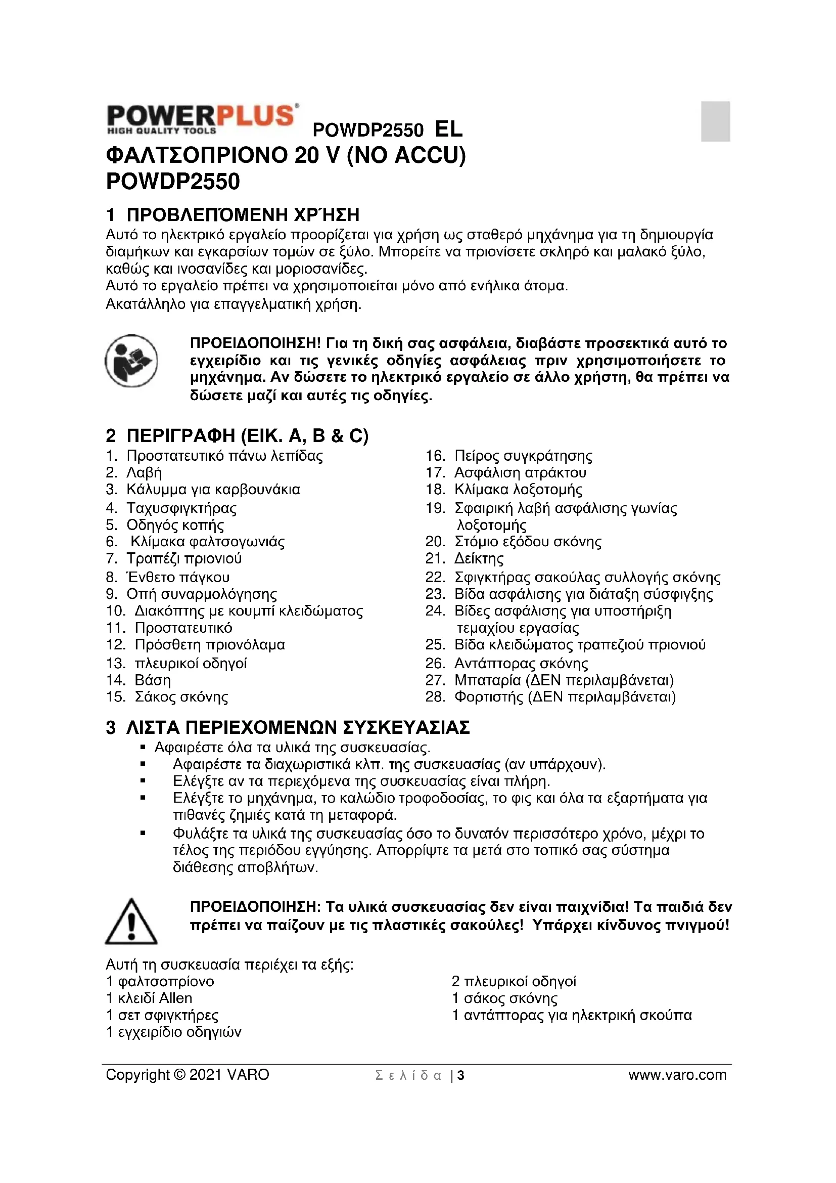 - 19 ΔΗΛΩΣΗ ΣΥΜΜΟΡΦΩΣΗΣ POWDP2550 EL Copyright © 2021 VARO Σ ε λ ί δ α | 3 www.varo.com ΦΑΛΤΣΟΠΡΙΟΝΟ 20 V (NO ACCU) POWDP2550 1 ΠΡΟΒΛΕΠΌΜΕΝΗ ΧΡΉΣΗ Αυτό το ηλεκτρικό εργαλείο προορίζεται για χρήση ως σταθερό μηχάνημα για τη δημιουργία διαμήκων και εγκαρσίων τομών σε ξύλο. Μπορείτε να πριονίσετε σκληρό και μαλακό ξύλο, καθώς και ινοσανίδες και μοριοσανίδες. Αυτό το εργαλείο πρέπει να χρησιμοποιείται μόνο από ενήλικα άτομα. Ακατάλληλο για επαγγελματική χρήση. ΠΡΟΕΙΔΟΠΟΙΗΣΗ! Για τη δική σας ασφάλεια, διαβάστε προσεκτικά αυτό το εγχειρίδιο και τις γενικές οδηγίες ασφάλειας πριν χρησιμοποιήσετε το μηχάνημα. Αν δώσετε το ηλεκτρικό εργαλείο σε άλλο χρήστη, θα πρέπει να δώσετε μαζί και αυτές τις οδηγίες. 2 ΠΕΡΙΓΡΑΦΗ (ΕΙΚ. A, B & C) p. 15