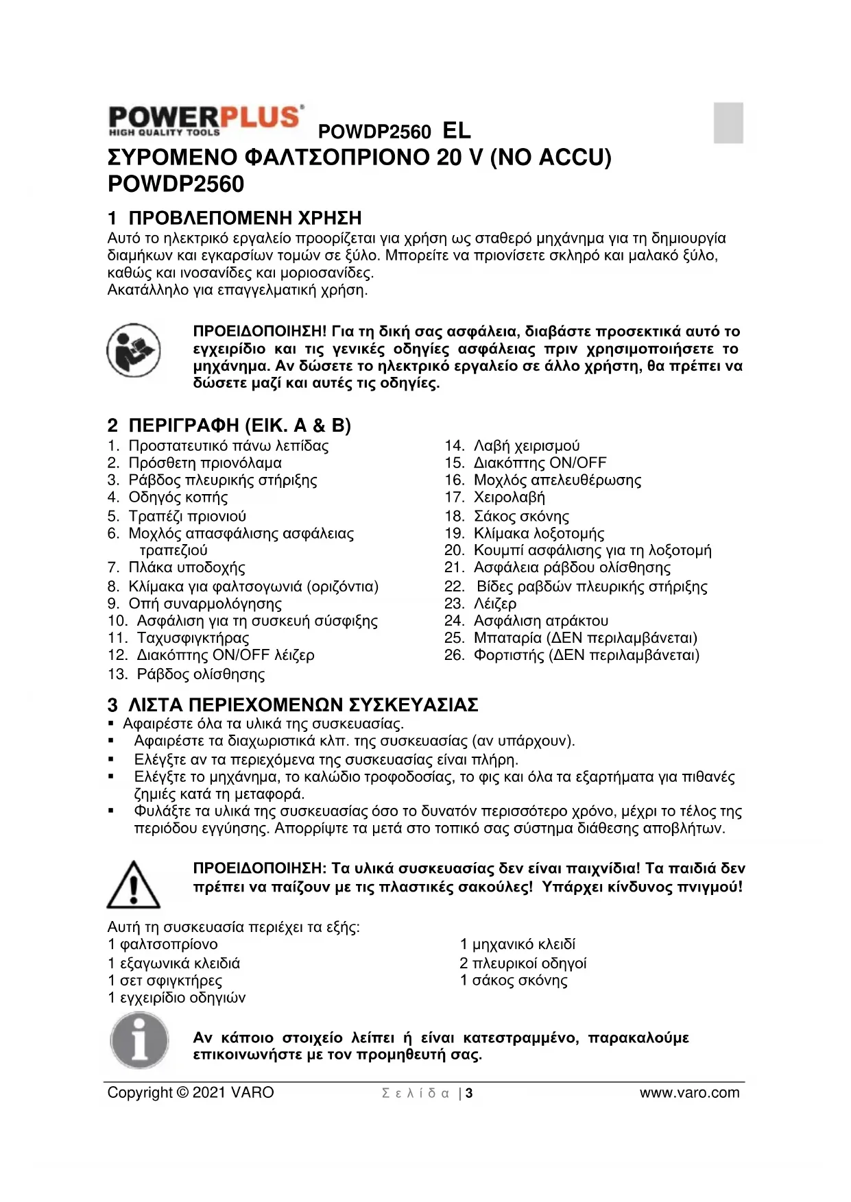 - 20 ΔΗΛΩΣΗ ΣΥΜΜΟΡΦΩΣΗΣ POWDP2560 EL Copyright © 2021 VARO Σ ε λ ί δ α | 3 www.varo.com ΣΥΡΟΜΕΝΟ ΦΑΛΤΣΟΠΡΙΟΝΟ 20 V (NO ACCU) POWDP2560 1 ΠΡΟΒΛΕΠΟΜΕΝΗ ΧΡΗΣΗ Αυτό το ηλεκτρικό εργαλείο προορίζεται για χρήση ως σταθερό μηχάνημα για τη δημιουργία διαμήκων και εγκαρσίων τομών σε ξύλο. Μπορείτε να πριονίσετε σκληρό και μαλακό ξύλο, καθώς και ινοσανίδες και μοριοσανίδες. Ακατάλληλο για επαγγελματική χρήση. ΠΡΟΕΙΔΟΠΟΙΗΣΗ! Για τη δική σας ασφάλεια, διαβάστε προσεκτικά αυτό το εγχειρίδιο και τις γενικές οδηγίες ασφάλειας πριν χρησιμοποιήσετε το μηχάνημα. Αν δώσετε το ηλεκτρικό εργαλείο σε άλλο χρήστη, θα πρέπει να δώσετε μαζί και αυτές τις οδηγίες. 2 ΠΕΡΙΓΡΑΦΗ (ΕΙΚ. A & B) p. 16