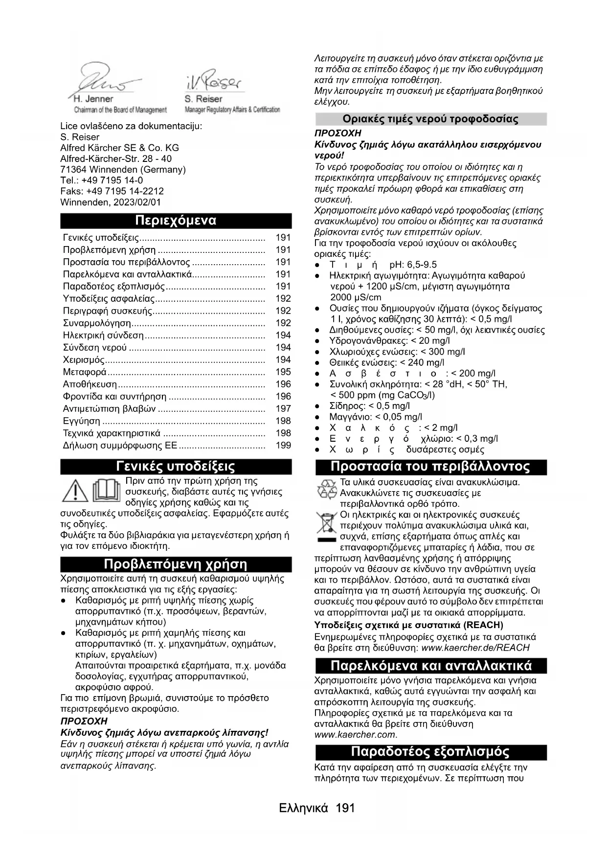 • /l) ● Σίδηρος: < 0,5 mg/l ● Μαγγάνιο: < 0,05 mg/l ●Χαλκός: < 2 mg/l ●Ενεργό χλώριο: < 0,3 mg/l ●Χωρίς δυσάρεστες οσμές Προστασία του περιβάλλοντος Τα υλικά συσκευασίας είναι ανακυκλώσιμα. Ανακυκλώνετε τις συσκευασίες με περιβαλλοντικά ορθό τρόπο. Οι ηλεκτρικές και οι ηλεκτρονικές συσκευές περιέχουν πολύτιμα ανακυκλώσιμα υλικά και, συχνά, επίσης εξαρτήματα όπως απλές και επαναφορτιζόμενες μπαταρίες ή λάδια, που σε περίπτωση λανθασμένης χρήσης ή απόρριψης μπορούν να θέσουν σε κίνδυνο την ανθρώπινη υγεία και το περιβάλλον . Ωστόσο, αυτά τα συστατικά είναι απαραίτητα για τη σωστή λειτουργία της συσκευής. Οι συσκευές που φέρουν αυτό το σύμβολο δεν επιτρέπεται να απορρίπτονται μαζί με τα οικιακά απορρίμματα. Υποδείξεις σχετικά με συστατικά (REACH) Ενημερωμένες πληροφορίες σχετικά με τα συστατικά θα βρείτε στη διεύθυνση: www.kaercher.de/REACH Παρελκόμενα και ανταλλακτικά Χρησιμοποιείτε μόνο γνήσια παρελκόμενα και γνήσια ανταλλακτικά, καθώς αυτά εγγυώνται την ασφαλή και απρόσκοπτη λειτουργία της συσκευής. Πληροφορίες σχετικά με τα παρελκόμενα και τα ανταλλακτικά θα βρείτε στη διεύθυνση www.kaercher.com. Παραδοτέος εξοπλισμός Κατά την αφαίρεση από τη συσκευασία ελέγξτε την πληρότητα των περιεχομένων. Σε περίπτωση που Γενικές υποδείξεις p. 191