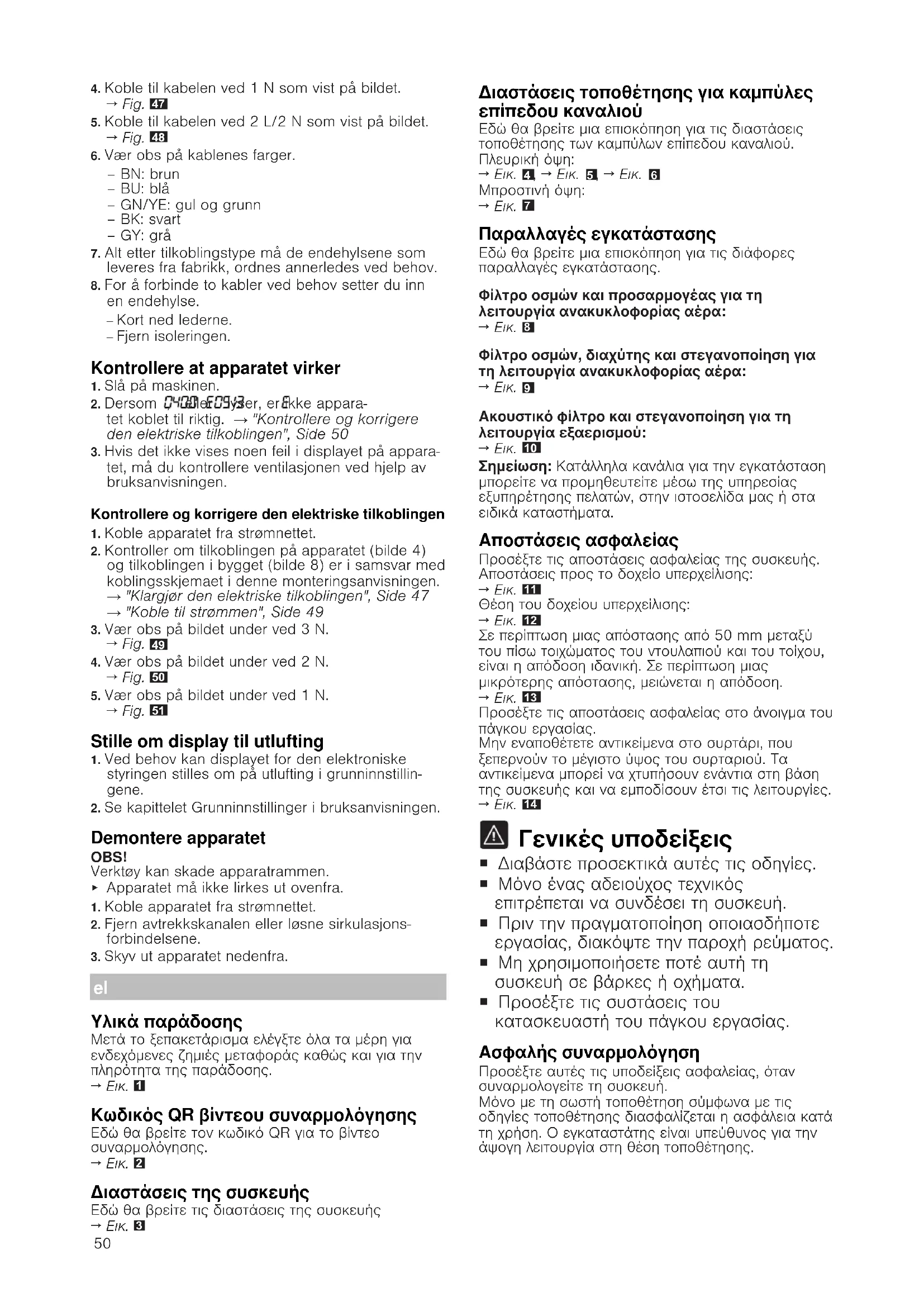Γενικές υποδείξεις ¡ Διαβάστε προσεκτικά αυτές τις οδηγίες. ¡ Μόνο ένας αδειούχος τεχνικός επιτρέπεται να συνδέσει τη συσκευή. ¡ Πριν την πραγματοποίηση οποιασδήποτε εργασίας, διακόψτε την παροχή ρεύματος. ¡ Μη χρησιμοποιήσετε ποτέ αυτή τη συσκευή σε βάρκες ή οχήματα. ¡ Προσέξτε τις συστάσεις του κατασκευαστή του πάγκου εργασίας. Ασφαλής συναρμολόγηση Προσέξτε αυτές τις υποδείξεις ασφαλείας, όταν συναρμολογείτε τη συσκευή. Μόνο με τη σωστή τοποθέτηση σύμφωνα με τις οδηγίες τοποθέτησης διασφαλίζεται η ασφάλεια κατά τη χρήση. Ο εγκαταστάτης είναι υπεύθυνος για την άψογη λειτουργία στη θέση τοποθέτησης.51 ΠΡΟΕΙΔΟΠΟΙΗΣΗ‒Κίνδυνος: Μαγνητισμός! Η συσκευή περιέχει μόνιμους μαγνήτες. Αυτοί μπορούν να επηρεάσουν αρνητικά τα ηλεκτρονικά στοιχεία εμφύτευσης, π.χ. βηματοδότες καρδιάς ή αντλίες ινσουλίνης. ▶ Οι φορείς ηλεκτρονικών στοιχείων εμφύτευσης πρέπει να τηρούν μια ελάχιστη απόσταση 10 cm από τη συσκευή. ΠΡΟΕΙΔΟΠΟΙΗΣΗ‒Κίνδυνος δηλητηρίασης! Τα επαναρροφούμενα αέρια καύσης μπορούν να προκαλέσουν δηλητηριάσεις. Εστίες, εξαρτημένες από τον αέρα του περιβάλλοντος (π.χ. συσκευές θέρμανσης που λειτουργούν με αέριο, πετρέλαιο, ξύλο ή άνθρακα, ταχυθερμοσίφωνες, θερμαντήρες νερού) λαμβάνουν τον αέρα για καύση από τον χώρο τοποθέτησης και οδηγούν τα καυσαέρια μέσα από μια εγκατάσταση απαγωγής των καυσαερίων (π.χ. καμινάδα) στον έξω χώρο. Σε συνδυασμό με έναν ενεργοποιημένο απορροφητήρα αφαιρείται αέρας από την κουζίνα και τους γειτονικούς χώρους. Χωρίς επαρκή παροχή αέρα δημιουργείται μια υποπίεση. Τα δηλητηριώδη αέρια από την καμινάδα ή τον απορροφητήρα επιστρέφουν πίσω στα δωμάτια του